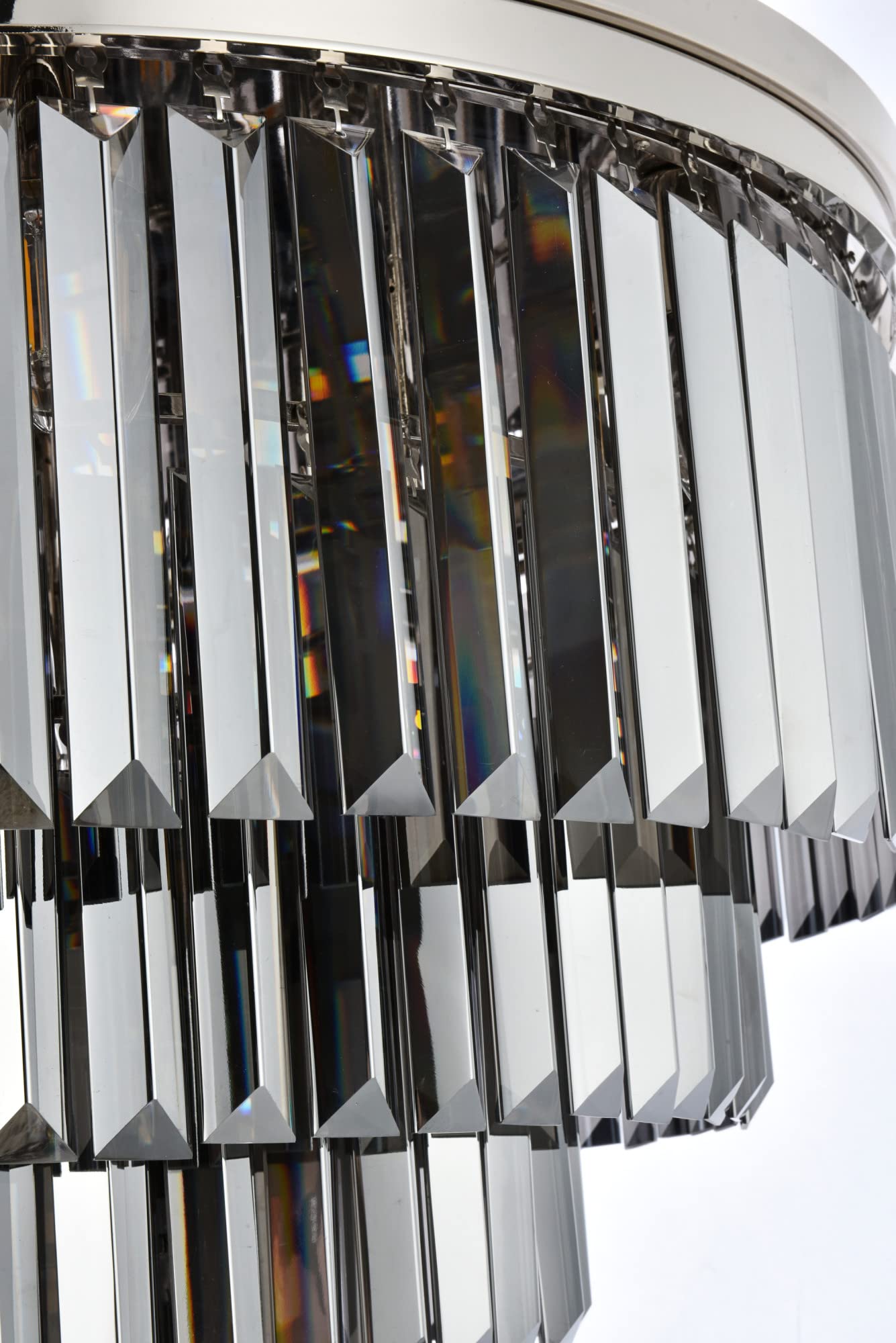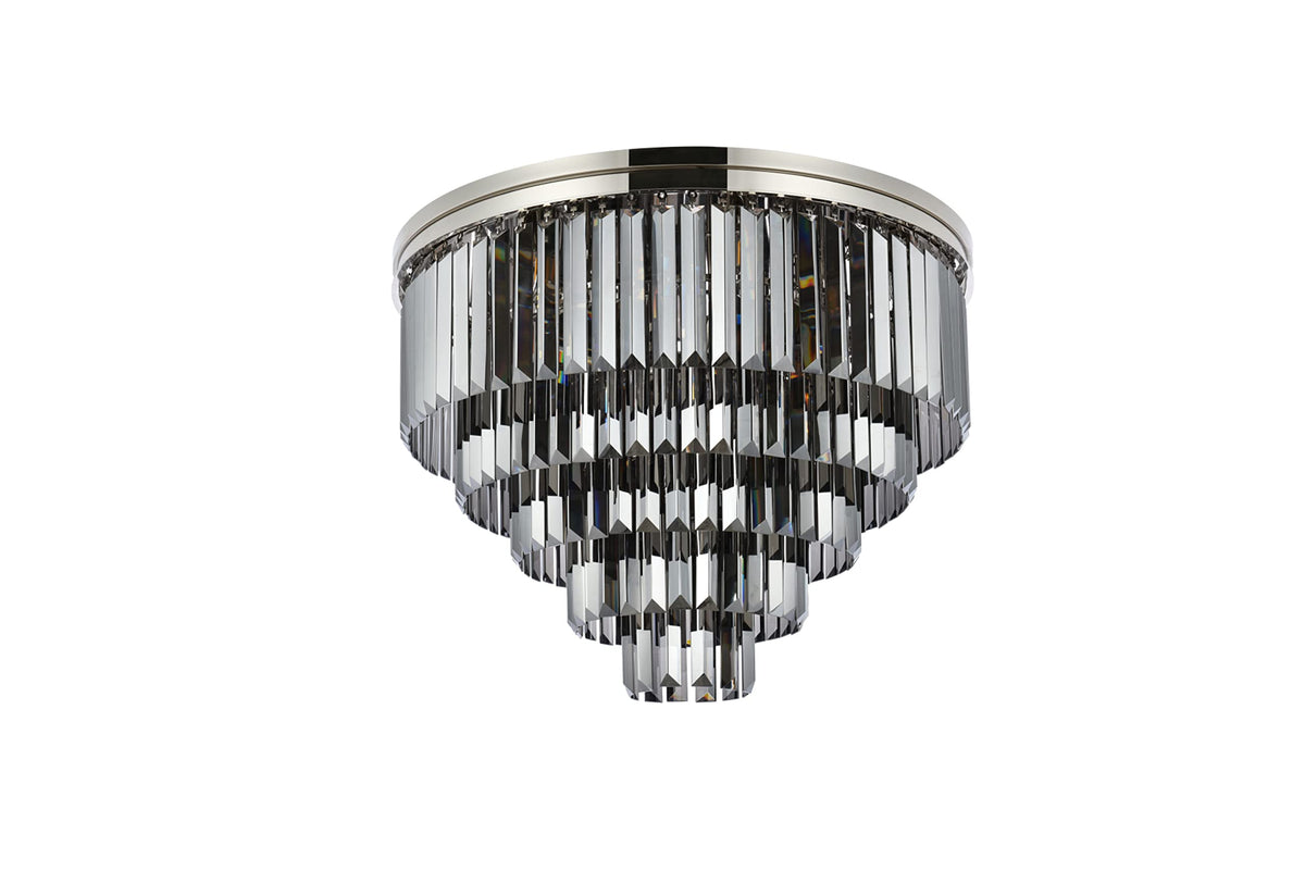 Timeless splendor and modern refinement are brought together in flush-mount Sydney fixtures. Dazzling in dining rooms, staircases, or hallways, the Sydney collection flaunts stunning tiers of royal-cut crystals in clear, golden teak, or Silver shade. A circular mocha-brown or polished-nickel finished steel frame adds understated charm to this stunning flush-mount lamp.