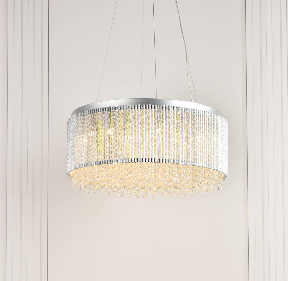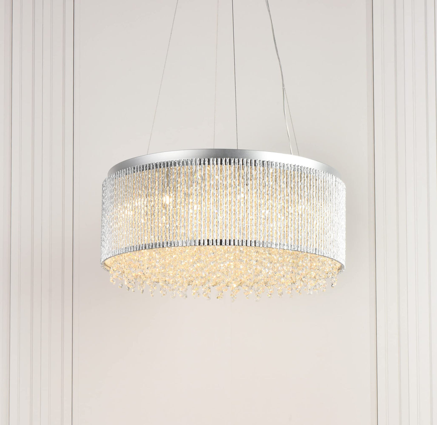This ring of celestial light will leave an impression of dynamic resonance in your bedroom, dining room, or entryway with the Influx collection of hanging fixtures. Multifaceted royal-cut clear crystal beads dance within a glistening chrome silhouette of metallic twists. Be swept you off your feet by this contemporary lighting fixture that inspires a glow of brilliant, breathtaking wonder. 14 Light Pendant Collection: Influx Finish: Chrome Width: 24.00 Height: 12.00 Safery Rating: UL,ULC Safety Listing: UL,ULC Bulbs: 14 X G-9 20.00W UL Approved Hardwired Bulbs Not included