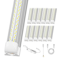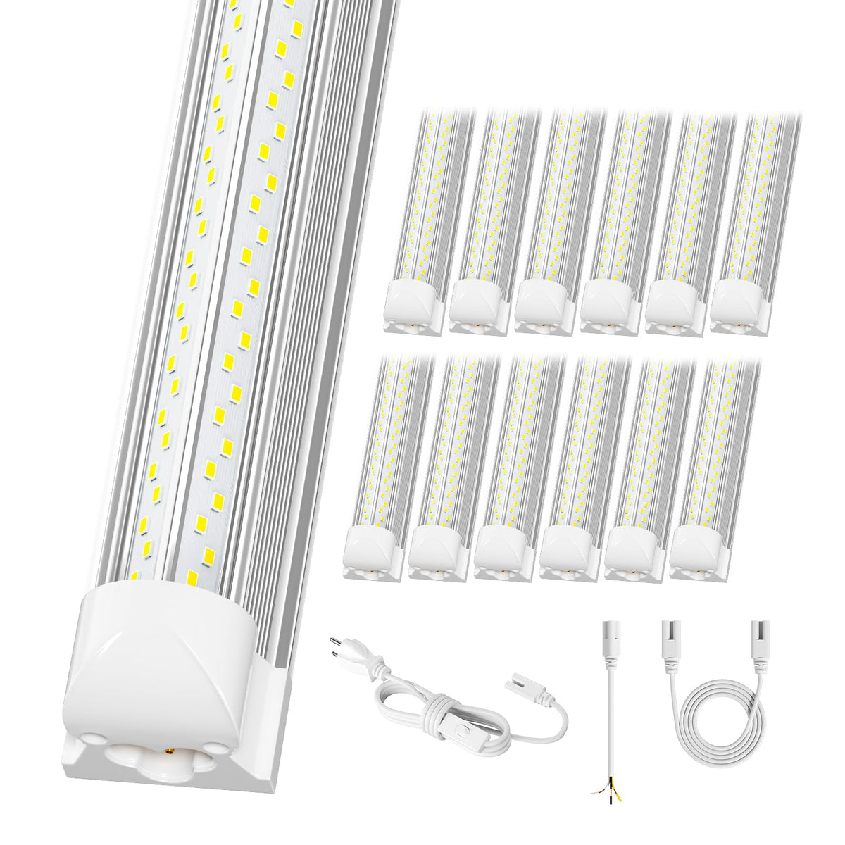High Brightness-- 100W 8Ft Led Shop Light, 15000Lm 5000K 150Lm/W, Ac100-277V Input, 4 Row 768Pcs Leds Chip, V-Shaped Led Gives 270 Lighting What You Get--12 X Elekico 8' Led Shop Lights, 6X Power Cords With On/Off Switch, 12 X Power Hardwires, 13 X Installation Accessories, 12 X 2Ft Connector Cables Buy With Confidence--Please Try It, You Will Love It! This Will Be A Great Choice. We Are Confident In The Quality Of Our 8 Foot Led Shop Lights. I You With Incredible Lighting Effects! Linkable-- Linkable 8Ft Led Shop Light Connect Up To 3 Pcs Together In Your Garages, Workshops, Workbench Areas, Storage Areas, Warehouses, Basements, Equipment Rooms, Etc