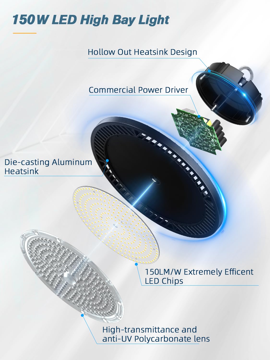 Elekico 150W 21000Lm 5000K Daylight Ip65 High Bay Light With Plug & 5Ft Cable - Ufo Led Lighting For Warehouse, Workshop, Factor