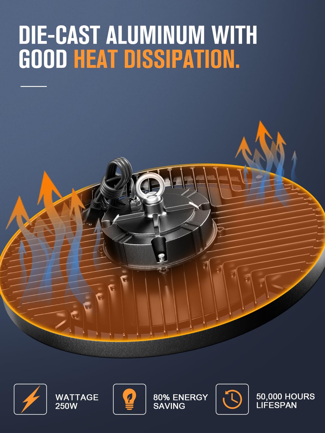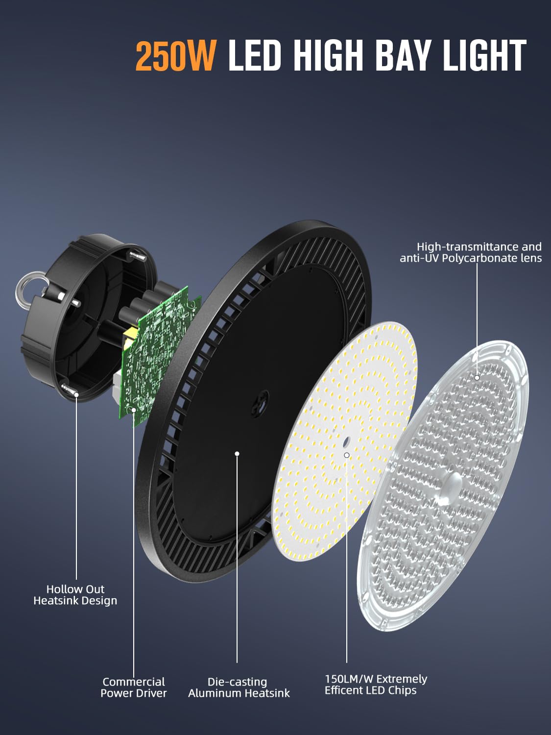 ?250W UFO Led High Bay Light?ELEKICO New Upgrade Led High Bay Light,Luminous efficiency up to 35000lm, With high-quality SMD2835 LED chips and a light efficiency of up to 140LM/W, Turn a dark garage into noon-time sunny with no dark spaces. ?Widely Used in More Scenario?This led high bay light can be used as a replacement for led shop lights.Led High Bay Light is not just suitable for garage, but also for storage area, workbench, basement, home, barn, office, station, attic, equipment rooms, gym, workshop, general lighting, display