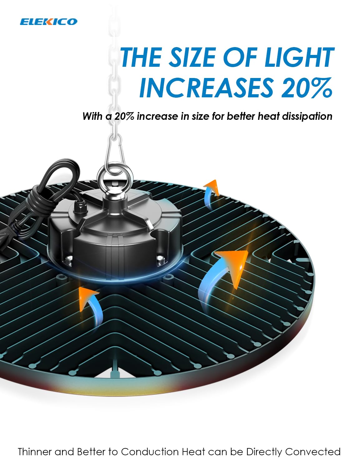 Get Ready To Redefine Your Lighting Experience With Elekico'S High Bay Led Shop Lights. Our Latest Upgrade To The 350W Ufo Led High Bay Light Delivers A Massive 52500Lm Illumination, Comparable To A 1200W Mh/Hps While Saving Up To 70% On Your Electricity Bill. Enhanced Heat Dissipation Features, Including A 20% Larger Light Size And Efficient Heat Management, Extend The Lifespan Of Your Ufo Led High Bay Light And Keep It Performing At Its Best. Its Hassle-Free Installation And Robust Design Make It An Ideal Choice For Commercial Lighting Applications. With A Wide Coverage Area, You Will Require Fewer Fixtures, Reducing Deployment And Running Costs. Its Versatility Makes It A Top Pick For A Range Of Settings, Including Warehouses, Factories, Gyms, And Retail Stores. Trust Elekico To Transform Your Commercial Spaces With Unparalleled Brightness And Efficiency. Let'S Illuminate The Future Together.