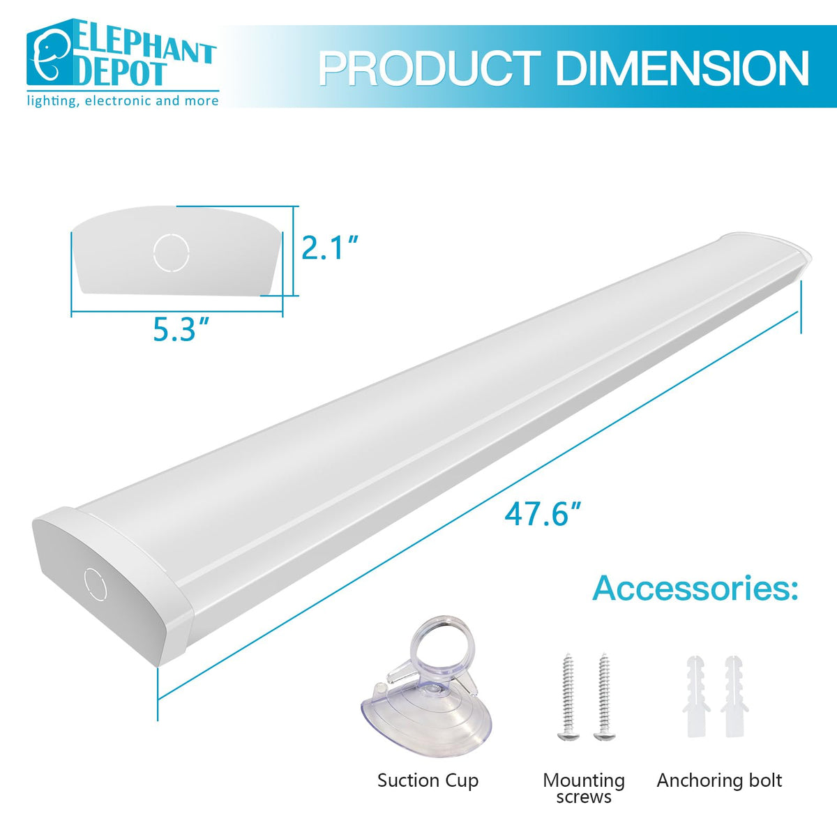 The 4Ft Led Wraparound Light Comes With Heavy-Duty Steel Housing With High Reflective, Matte Powder Coated Paint And High Transmission Frosted Lens, Which Provides A Uniform Lighting Surface While Maximizing The Total Generated Light.Elephant Depot Kitchen Lighting Fixtures Ceiling Can Deliver Up To 5520 Lumens Of Brightness, 115Lm/W Energy Efficiency Making It An Excellent Replacement For Low-Efficiency Fluorescent Lights.The 4Ft Led Kitchen Lighting Fixtures Ceiling Designed With Selectable Cct And Lumen So You Can Choose The Most Suitable Color Temperature And Brightness For Your Different Applications.Also The Wattage Of The Fluorescent Light Fixtures 4Ft Is Adjustable Which Will Make The Light More Energy Saving. The Kitchen Lighting Fixtures Ceiling Is Easy Mounting With Provided Hardware, It Is An Ideal Fixture For Many Applications Such As Supermarket,Shop, Warehouse, Workshop,Garage,Laundry Room,Kitchen,Storage,Closet.4 Foot Led Shop Lights For Laundry Room Is An Innovative, Sleek And Contemporary Low Profile Designed,Enhances Light Output And Distribution. It Can Illuminate A Larger Area Than Led Light Bar Or Fluorescence Of The Same Size. Eliminating The Bulky Aesthetics With Conventional Fixtures,Kitchen Lighting Fixtures Ceiling Can Be Used As Kitchen Ceiling Light,Closet Light Or Laundry Room Ceiling Light.Reliable Brand,Elephant Depot Is The Perfect Choice For Kitchen Lighting Fixtures Ceiling, We Provide Consumers With Satisfactory Products With Professional Technology.4Ft Kitchen Lighting Fixtures Ceiling Is Ul And Dlc Certified, You Don'T Have To Worry About Quality And Safety Issues. 50000Hr Service Life, 5 Years After-Sales Support