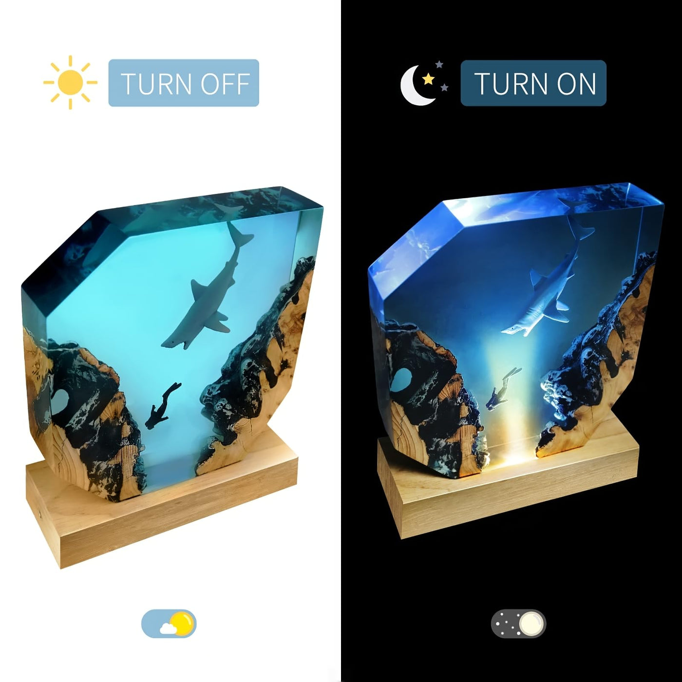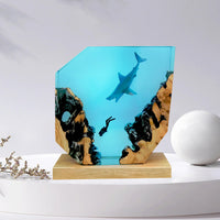 Q: What makes the eletriace Epoxy Resin Shark Lamp unique?A: The eletriace Epoxy Resin Shark Lamp is handcrafted, featuring a striking underwater scene with a diver and shark, created using transparent epoxy resin that gives a three-dimensional effect. Its unique design and superb craftsmanship make it an eye-catching decorative piece.