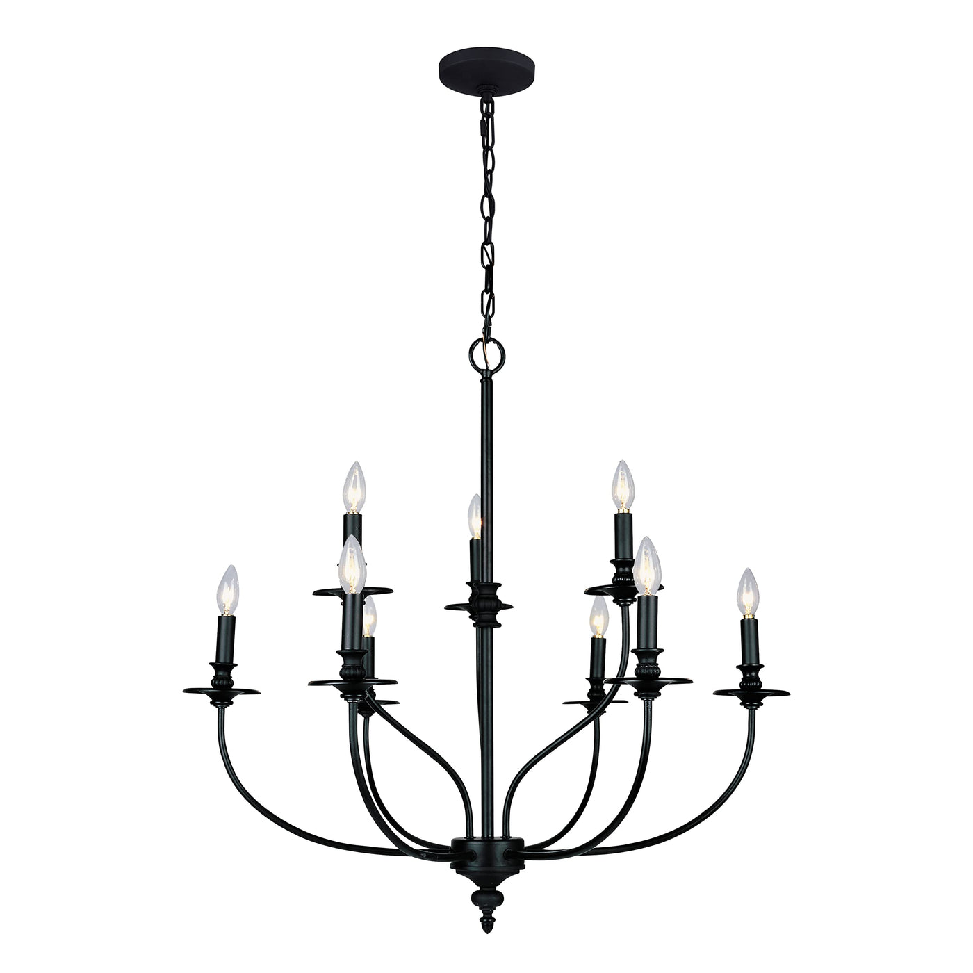 Q: What type of bulbs does this chandelier use?A: This chandelier uses nine 60 Watt B11 candelabra base bulbs, which are not included with the purchase. Ensure to select compatible bulbs for optimal lighting.