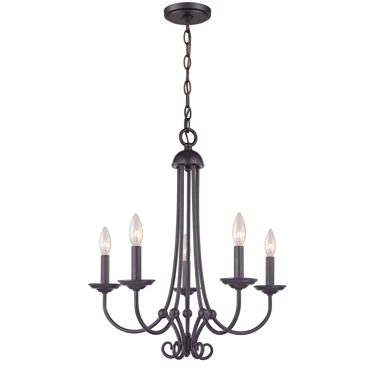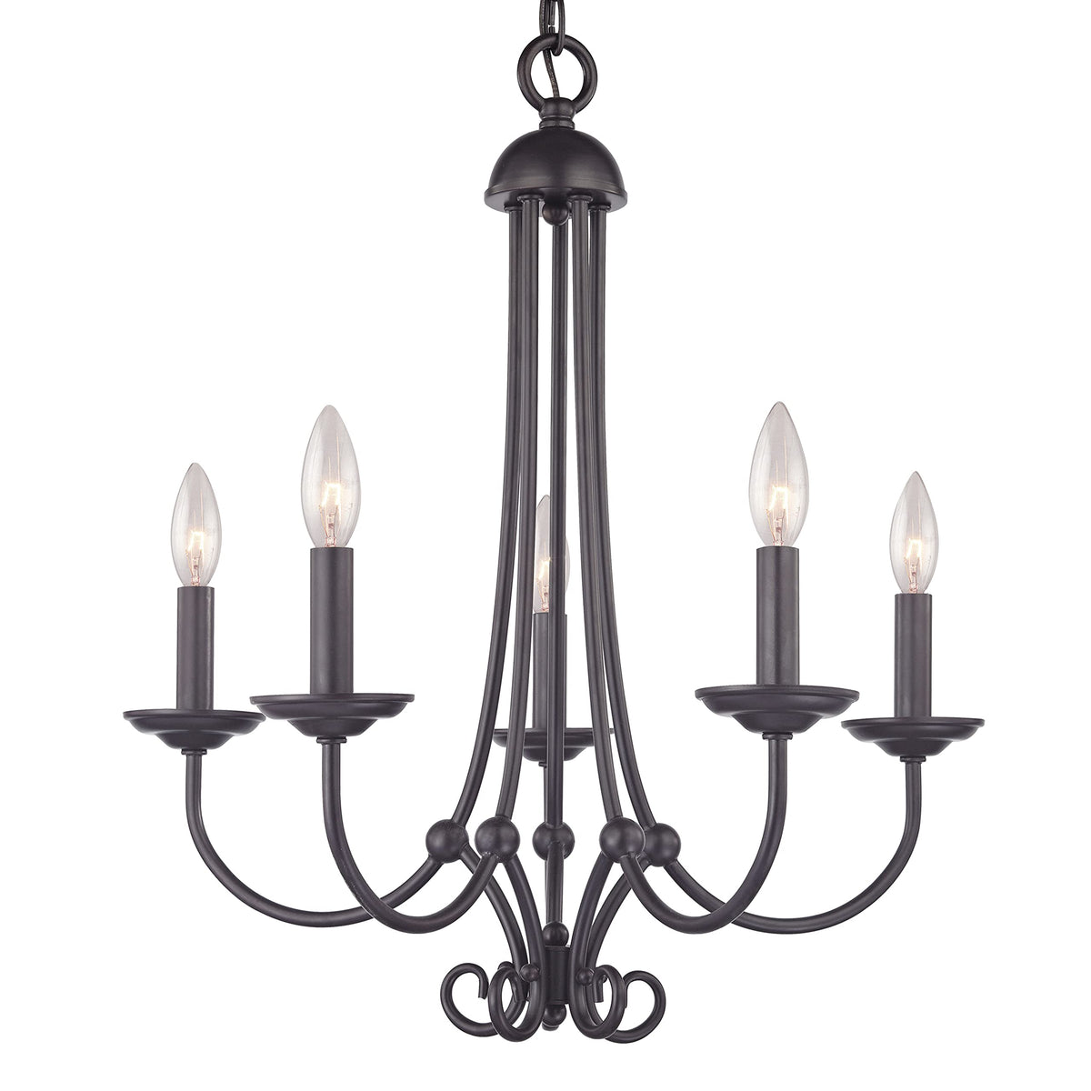 Q: What type of bulbs are compatible with this chandelier?A: This chandelier requires five 60-watt candelabra base bulbs, which are not included. It is also compatible with LED bulbs for energy-efficient lighting.