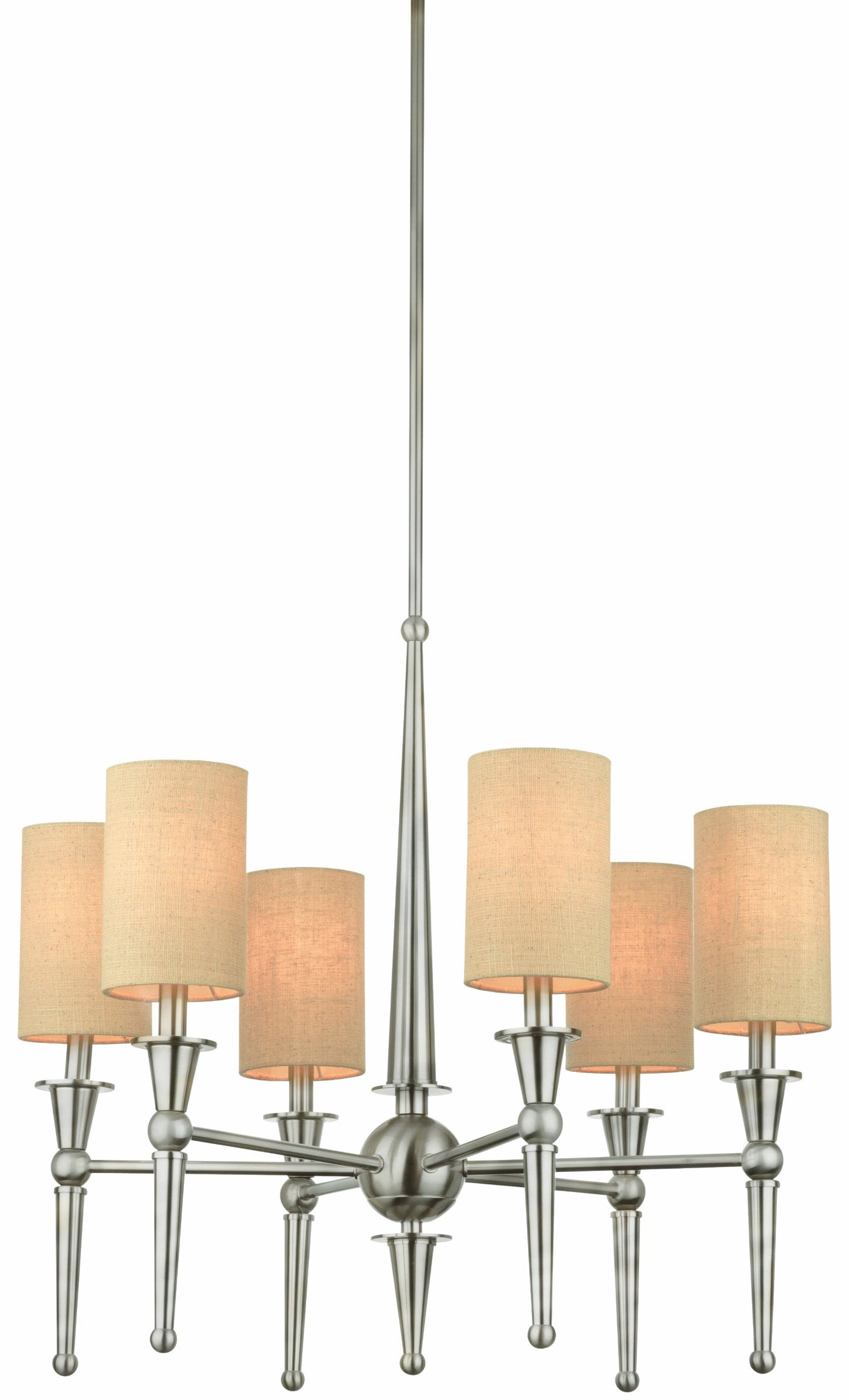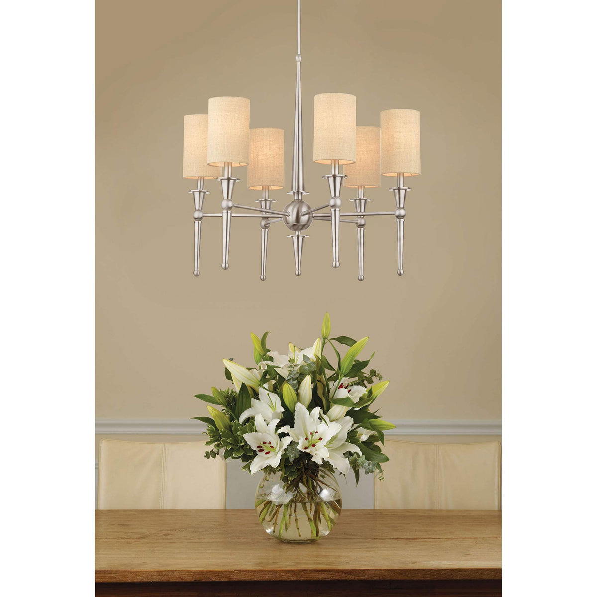 Q: Is the Thomas Lighting M209778 chandelier suitable for a modern decor?A: Yes, the Thomas Lighting M209778 Allure 6-Light Chandelier features a modern sleek design with brushed nickel finish and bone linen shimmer shades, making it an excellent choice for contemporary interiors. Its versatile style allows it to complement various spaces, including living rooms and dining areas.