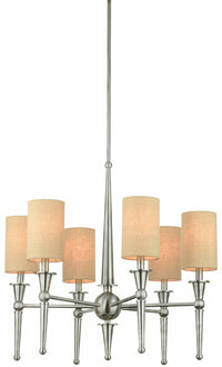 Q: What materials are used in the construction of this chandelier?A: The Thomas Lighting M209778 chandelier is constructed from stainless steel, which ensures durability and a modern look. The bone linen shimmer shades add a touch of elegance while diffusing light beautifully.