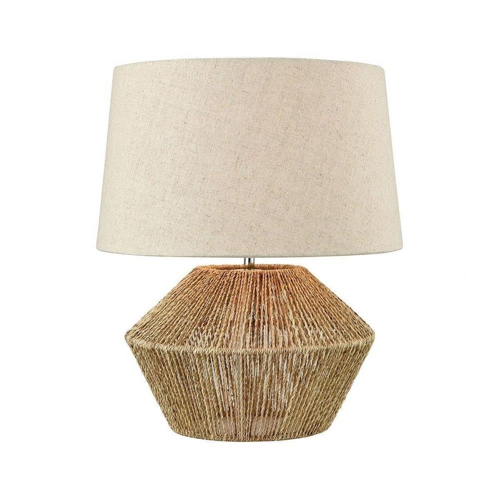 Q: What materials are used in the construction of this table lamp?A: This lamp is made from natural rope and metal, featuring an oatmeal linen fabric shade that complements its natural aesthetic.