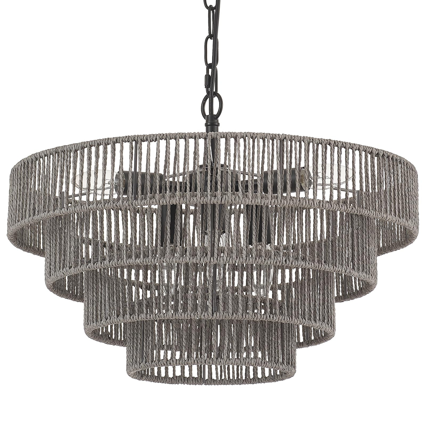 EYE-CATCHING DESIGN: This woven rattan chandelier is made of wicker woven on grey color with high-quality 4 round metal frames finished by brass, forming a semicircular hollow cage; The color gray exudes a casual elegance without sacrificing style, revealing an indescribable high-level charm for this modern chandelier. WE HAVE PATENT!