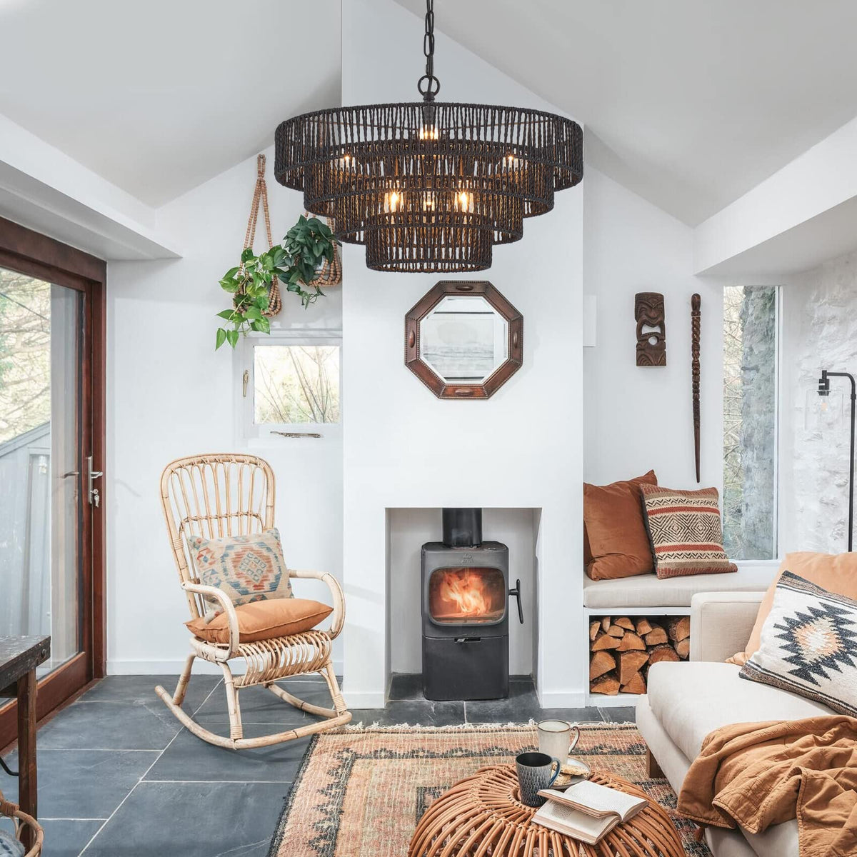 Q: What is the design style of the ELYCCUPA chandelier?A: The ELYCCUPA chandelier features a modern minimalist design combined with bohemian elements. Its hand-woven wicker twine and matte black finish create an eye-catching aesthetic that fits well in various decor styles, including modern, boho, and chic interiors.