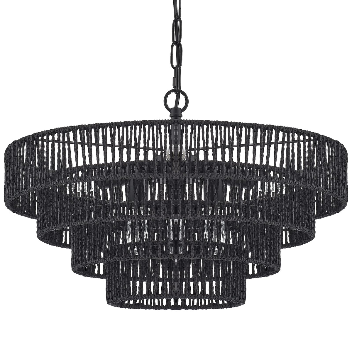 Elyccupa 20” Hand-Woven Rattan Chandelier 6-Lights Transitional Minimalist 4 Round Boho Large Pendant Light For Kitchen Island Dining Room Living Room Hallway, Matte Black, Ul Listed
