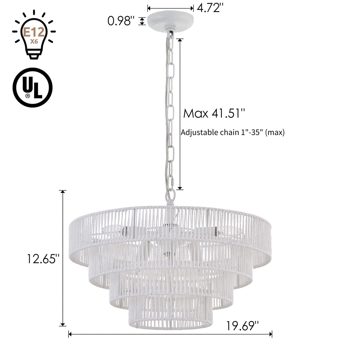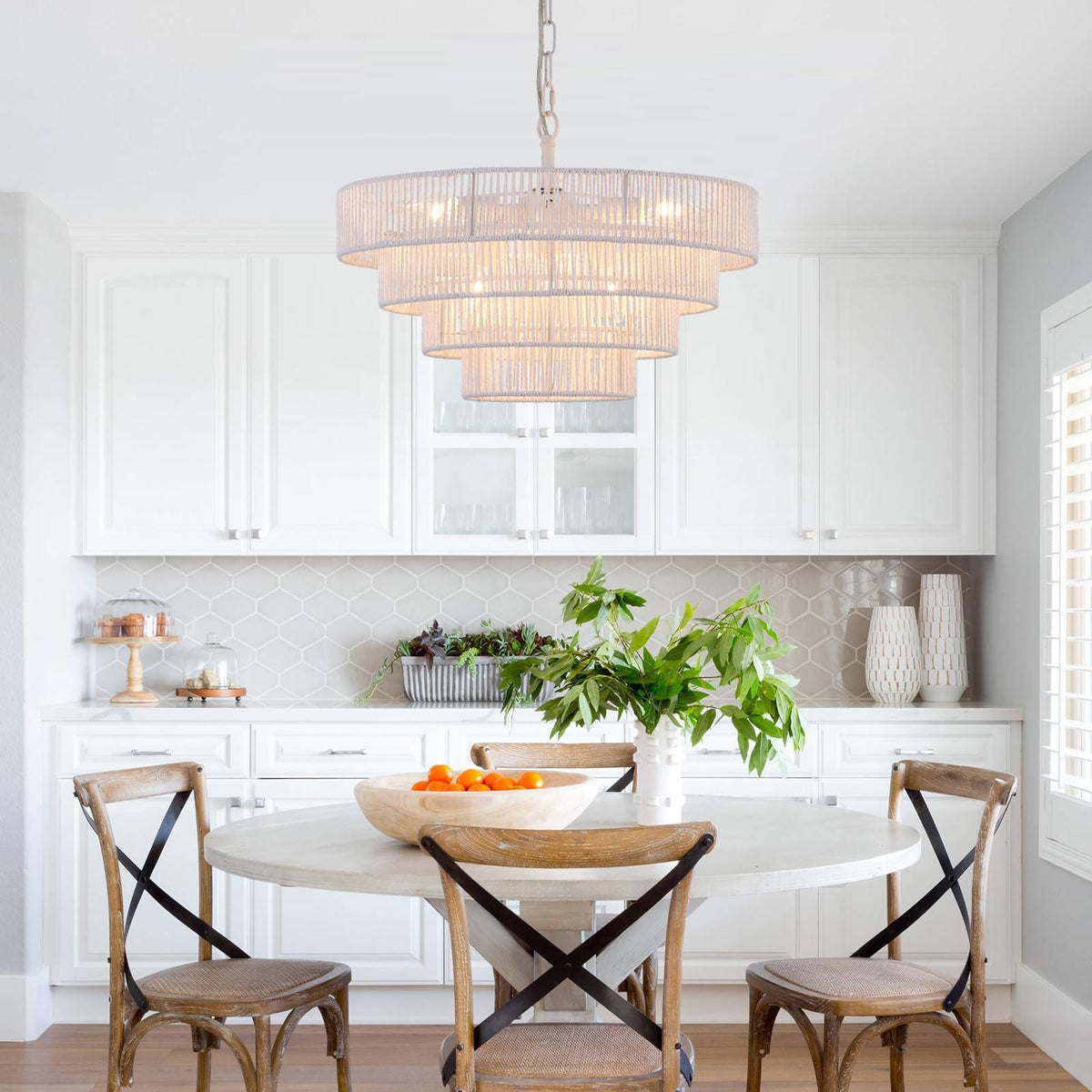 Elyccupa 6-Lights 20" Hand-Woven Rattan Pendant Light Coastal 4 Round Transitional Minimalist Boho Large Pendant Light, For Kitchen Island Dining Room Living Room Hallway, White, Ul Listed
