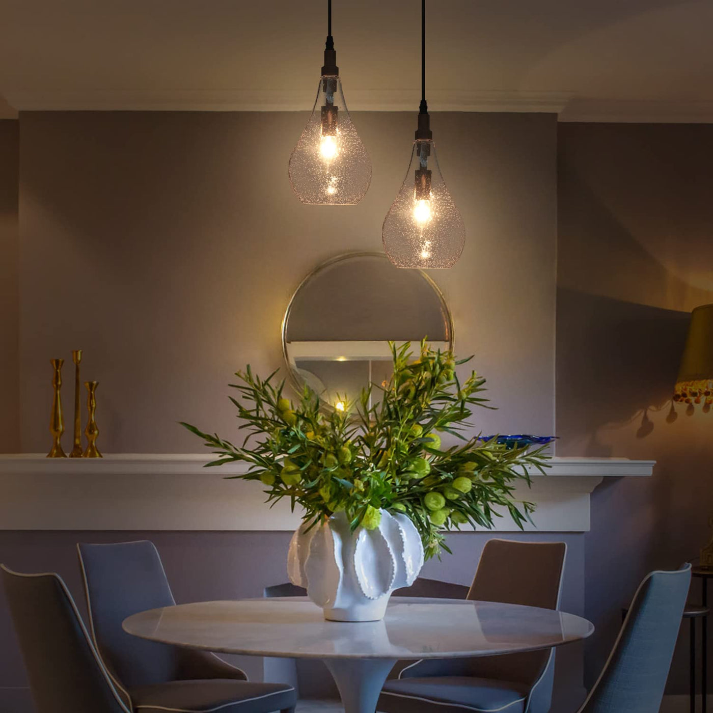 SEEDED GLASS Improve light transmittance for making the light reach wider range of you room; Easy to Clean and no need to worry about bubble or water stain on glass anymore! ADJUSTALBE Easy to install, adjustable strings from 1 to 56.07 , which is large size glass pendant light on the market, and more cost effective compared to others, and also compatible with sloped ceilings. E12 DIMMABLE SOCKET Accommodates 1 x E12 bulbs (60w max, bulbs not included); compatible with LED, incandescent, compact fluorescent, halogen bulbs, etc. It could be dimmable if you install compatible dimmable bulbs and switch; You could install with warm white 3000k, neutral white 4000k or cool white 6000k bulbs as you like;