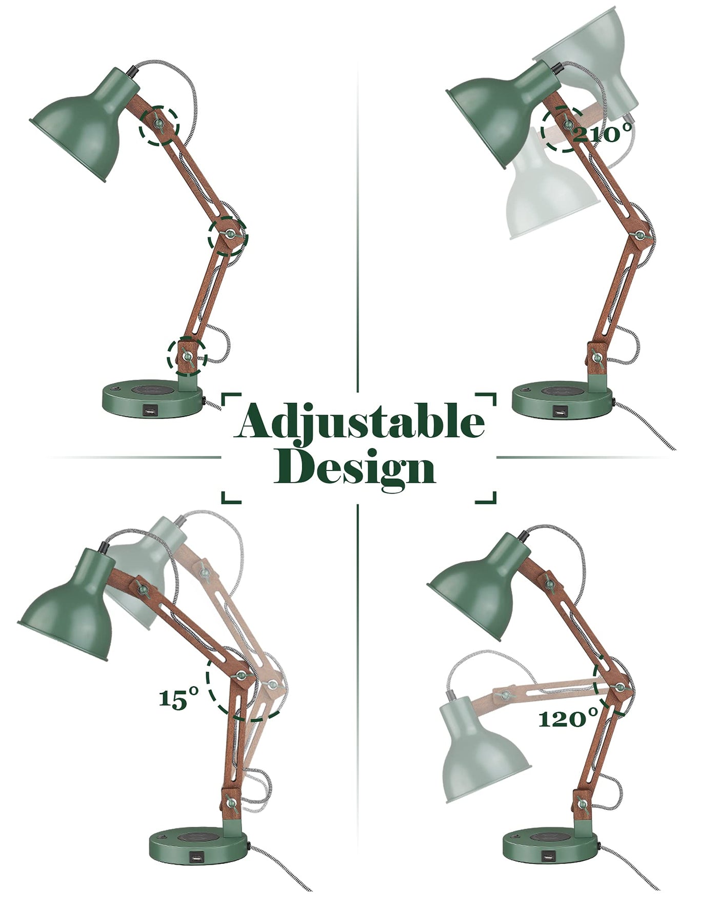 Classic solid wood meets iron, offering a firm, chemical-free design. The lamp features a sturdy vintage green metal shade and a premium nylon braided cable, ensuring durability for years of enjoyment. Its simple and sleek design makes it ideal for any space, including offices, dorms, farmhouses, reading rooms, living rooms, bedrooms, and bedside tables. This stylish lamp also makes a perfect gift for kids, teens, family, or friends.