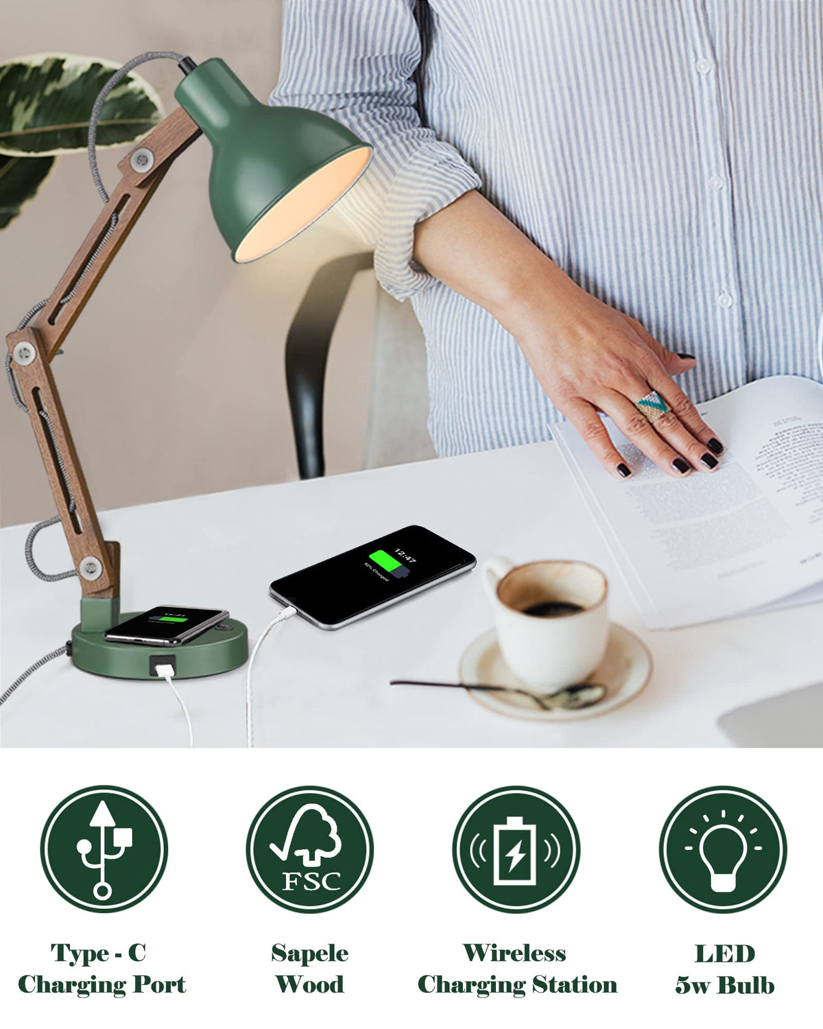 Elyona Led Desk Lamp With Wireless Charger, Sapele Wood, Vintage Green, Usb C, Bulb Included