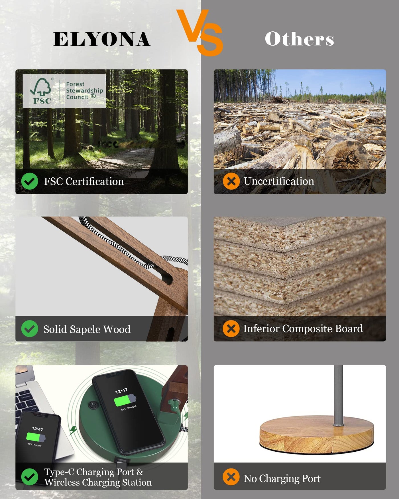 Q: What makes the ELYONA LED Desk Lamp environmentally friendly?A: The lamp is made from FSC Certified Sapele Wood, which is sourced sustainably and free from harmful chemicals like formaldehyde. This commitment to using natural materials helps create a healthier living space for you and your family.