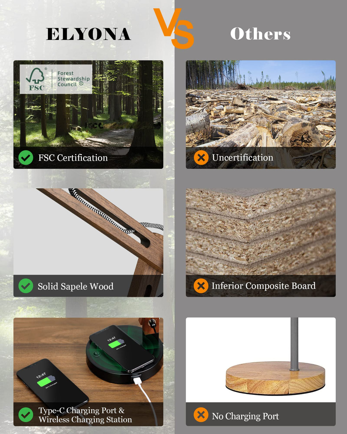FSC Certified Sapele Wood: Unlike fiberboard, ELYONA desk lamp is crafted from premium Sapele wood from Congo, free of glue and formaldehyde, promoting a healthy living space.