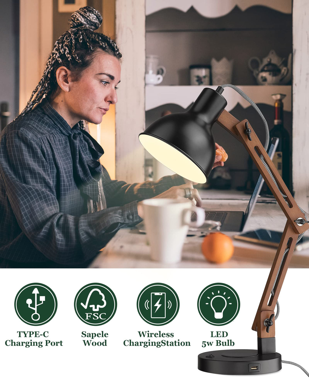 Modern Natural Living meets functionality with the ELYONA Swing Arm Desk Lamp, crafted from classic solid wood and iron, offering a firm and chemical-free lighting solution that enhances your workspace. This lamp features a wireless charging pad for effortless charging and a USB port that allows you to power two devices simultaneously, making it an essential addition to any office, farmhouse, reading room, living room, bedroom, or study.
