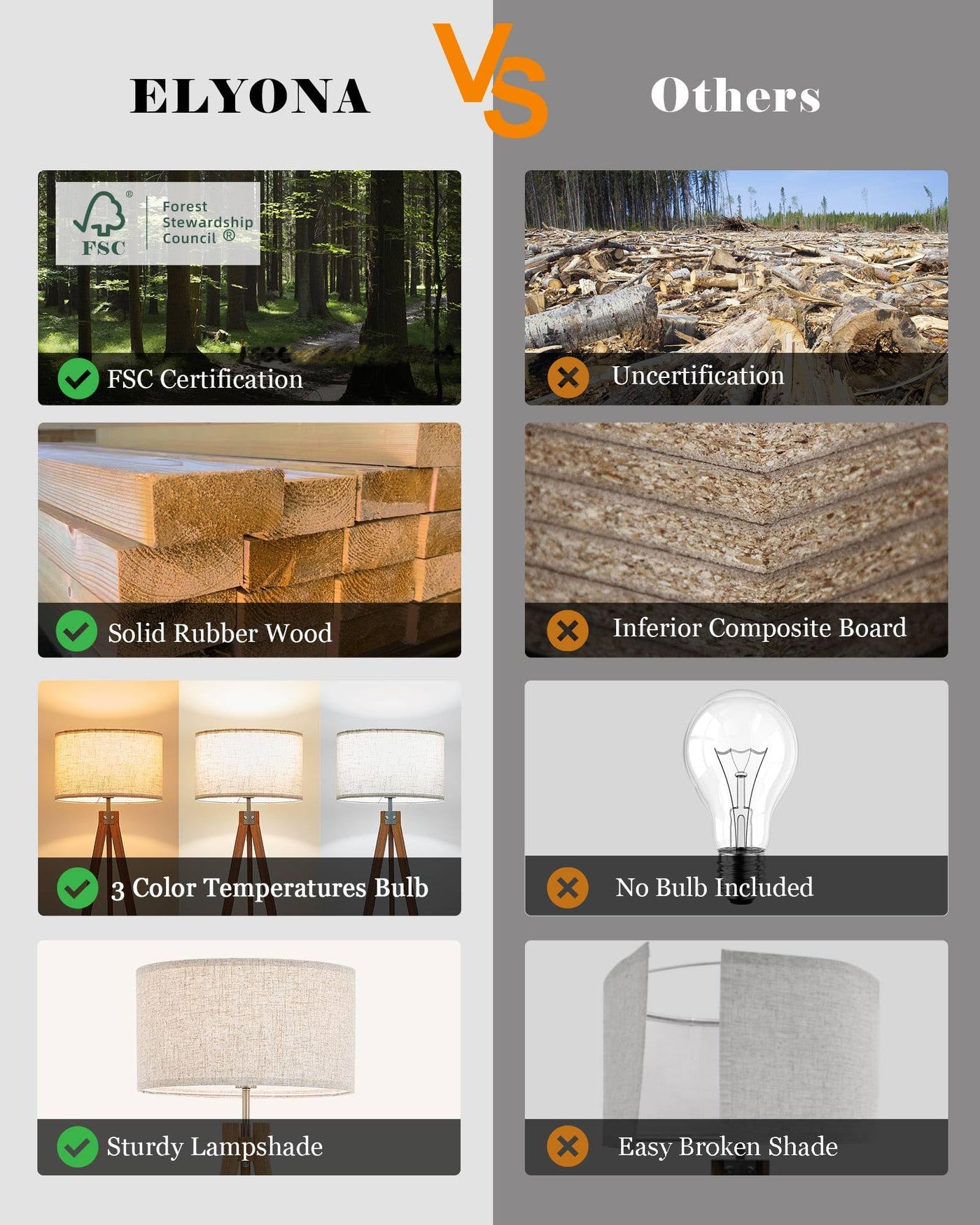 ? Hand Painted & FSC Listed Solid Wood ?Compared with other products, our wooden legs are thicker and more stable. NO MDF, NO Laminate, NO Veneer. ELYONA use high-quality FSC listed solid wood boards, Waterproof and anti-scratch,very easy to clean.Give consumers a better user experience. All our productions are designed by ourselves, we are direct manufacturers of our products. Each floor lamp is hand painted by experienced masters in our factory . Each piece is unique for you. ? Stylish Modern Solid Wood Tripod Floor Lamp? ELYONA standing lamp is combined with wood side table to put your phone, coffee cup, ornaments, magazine. It easy to match with a range of decor styles including rustic, industrial,farmhouse,boho,country, apartment or loft etc. Add a touch of modern natural feeling to your life.?The foot switch is convenient for enabling you to turn it on/off or adjust the light color with ease. ?Includes a 3-Color Temperatures LED Bulb (9W) offering 3000K warm light, 4500K natural light, and 6000K white light, providing suitable lighting for different usage scenarios, such as a night light in the bedroom, an ambient light or a reading light in the living room.?( please assure the replace bulb is less than 60 Watts) ?LED Energy-Saving Bulb Included?E26 3 3 Color Temperatures LED bulb included (9w). Long lifespan 25, 000 hours lifetime of the bulb can save your money greatly, and you won't need to replace them frequently. linen lamp shade, provide a gentle ambient brightness to create a comfortable environment and cozy for your eyes. perfect for reading, work, or rest. ( pls assure the replace bulb is less than 60 Watts)