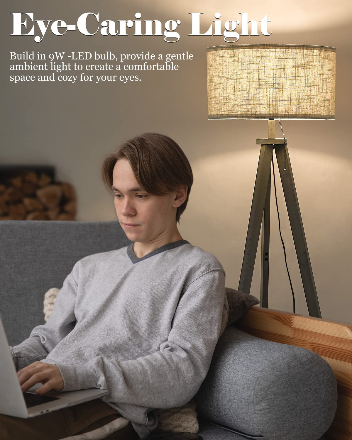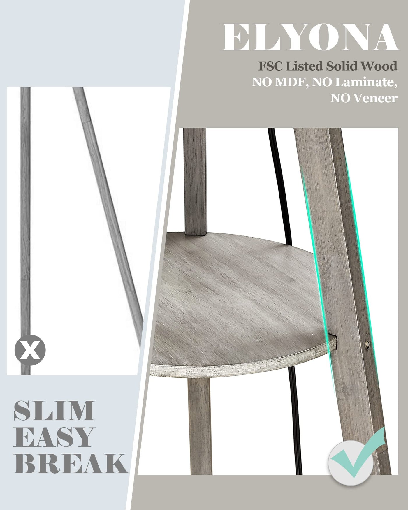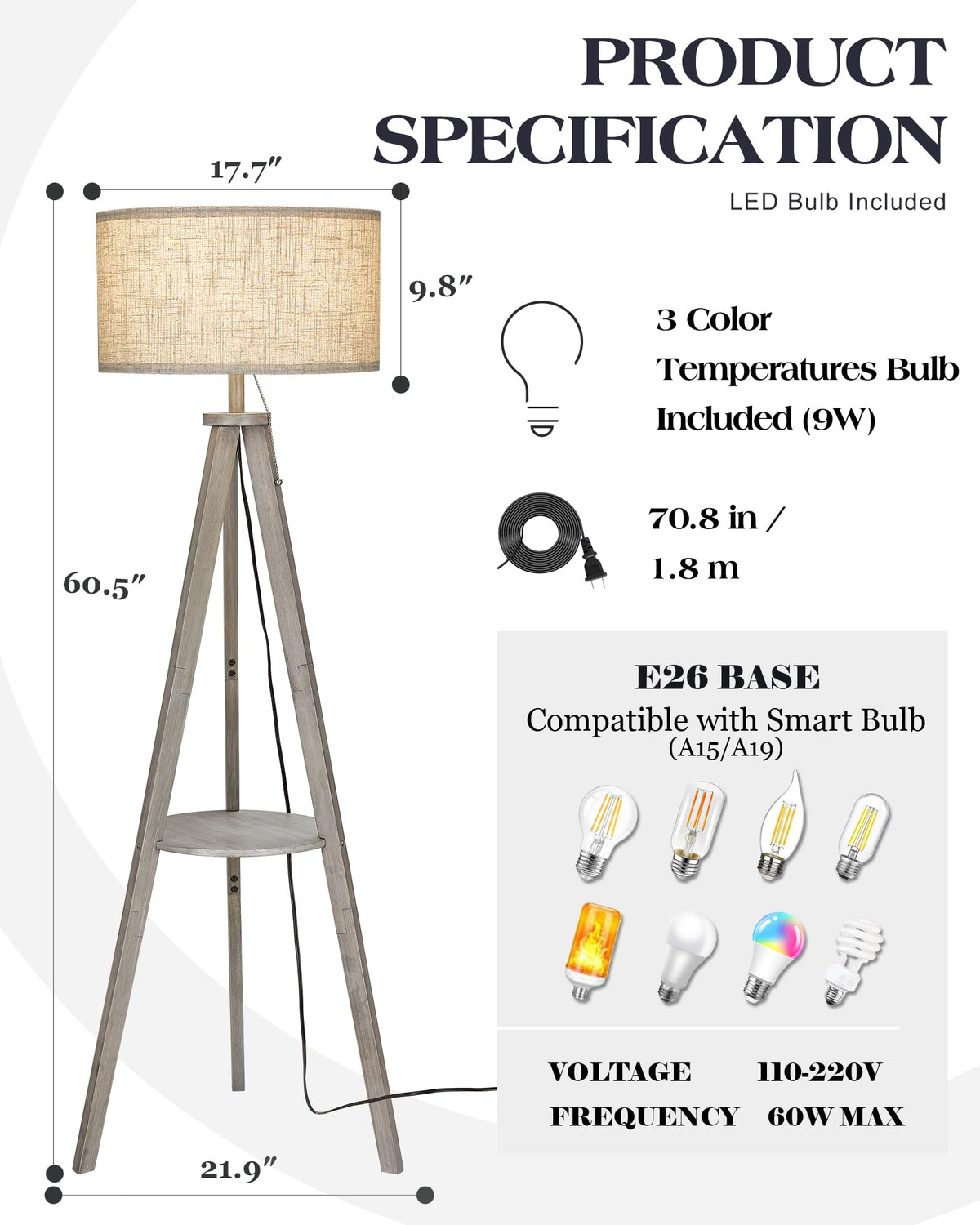 ? Hand Painted & FSC Listed Solid Wood ?Compared with other products, our wooden legs are thicker and more stable. NO MDF, NO Laminate, NO Veneer. ELYONA use high-quality FSC listed solid wood boards, Waterproof and anti-scratch,very easy to clean.Give consumers a better user experience. All our productions are designed by ourselves, we are direct manufacturers of our products. Each floor lamp is hand painted by experienced masters in our factory . Each piece is unique for you. ? Stylish Modern Solid Wood Tripod Floor Lamp? ELYONA standing lamp is combined with wood side table to put your phone, coffee cup, ornaments, magazine. It easy to match with a range of decor styles including rustic, industrial,farmhouse,boho,country, apartment or loft etc. Add a touch of modern natural feeling to your life.?The foot switch is convenient for enabling you to turn it on/off or adjust the light color with ease. ?Includes a 3-Color Temperatures LED Bulb (9W) offering 3000K warm light, 4500K natural light, and 6000K white light, providing suitable lighting for different usage scenarios, such as a night light in the bedroom, an ambient light or a reading light in the living room.?( please assure the replace bulb is less than 60 Watts) ?LED Energy-Saving Bulb Included?E26 LED bulb included (3000k / 9w). Long lifespan 25, 000 hours lifetime of the bulb can save your money greatly, and you won't need to replace them frequently. linen lamp shade, provide a gentle ambient brightness to create a comfortable environment and cozy for your eyes. perfect for reading, work, or rest. ( pls assure the replace bulb is less than 60 Watts)