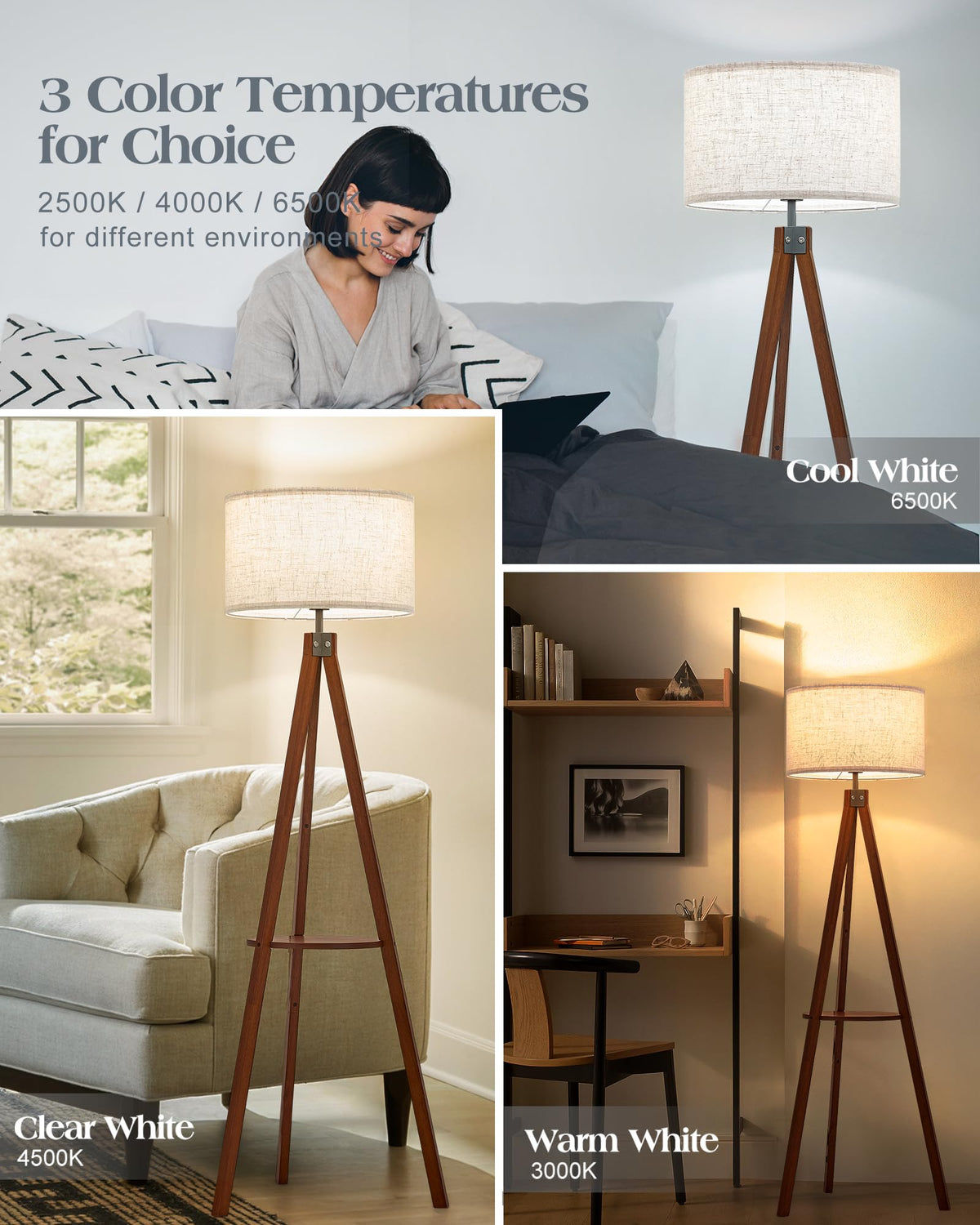 Q: What are the color temperature options for the ELYONA Tripod Floor Lamp?A: The ELYONA Tripod Floor Lamp includes a 3-Color Temperatures E26 LED Bulb that offers three settings: 3000K warm light, 4500K natural light, and 6000K white light, making it suitable for various environments like bedrooms and living rooms.