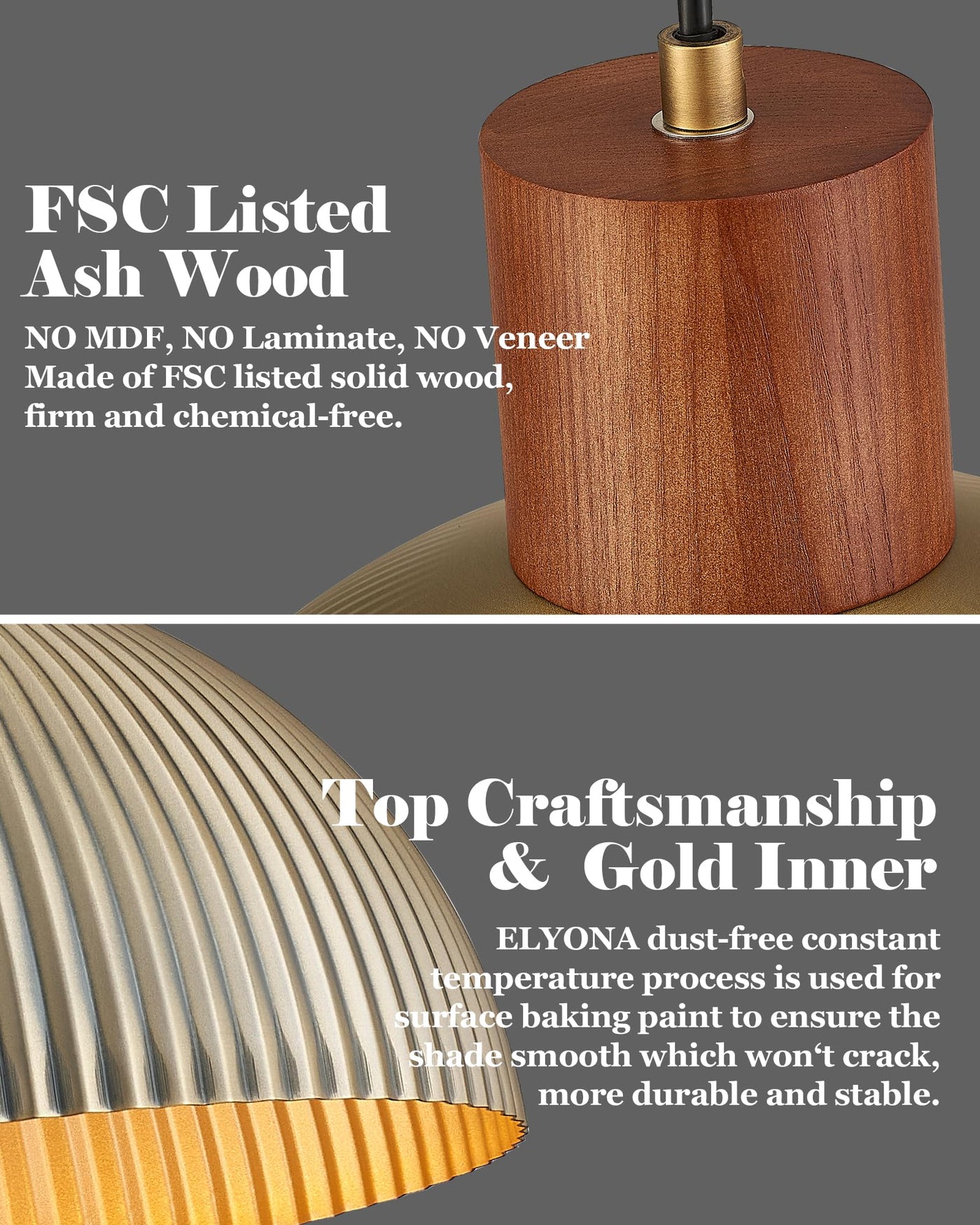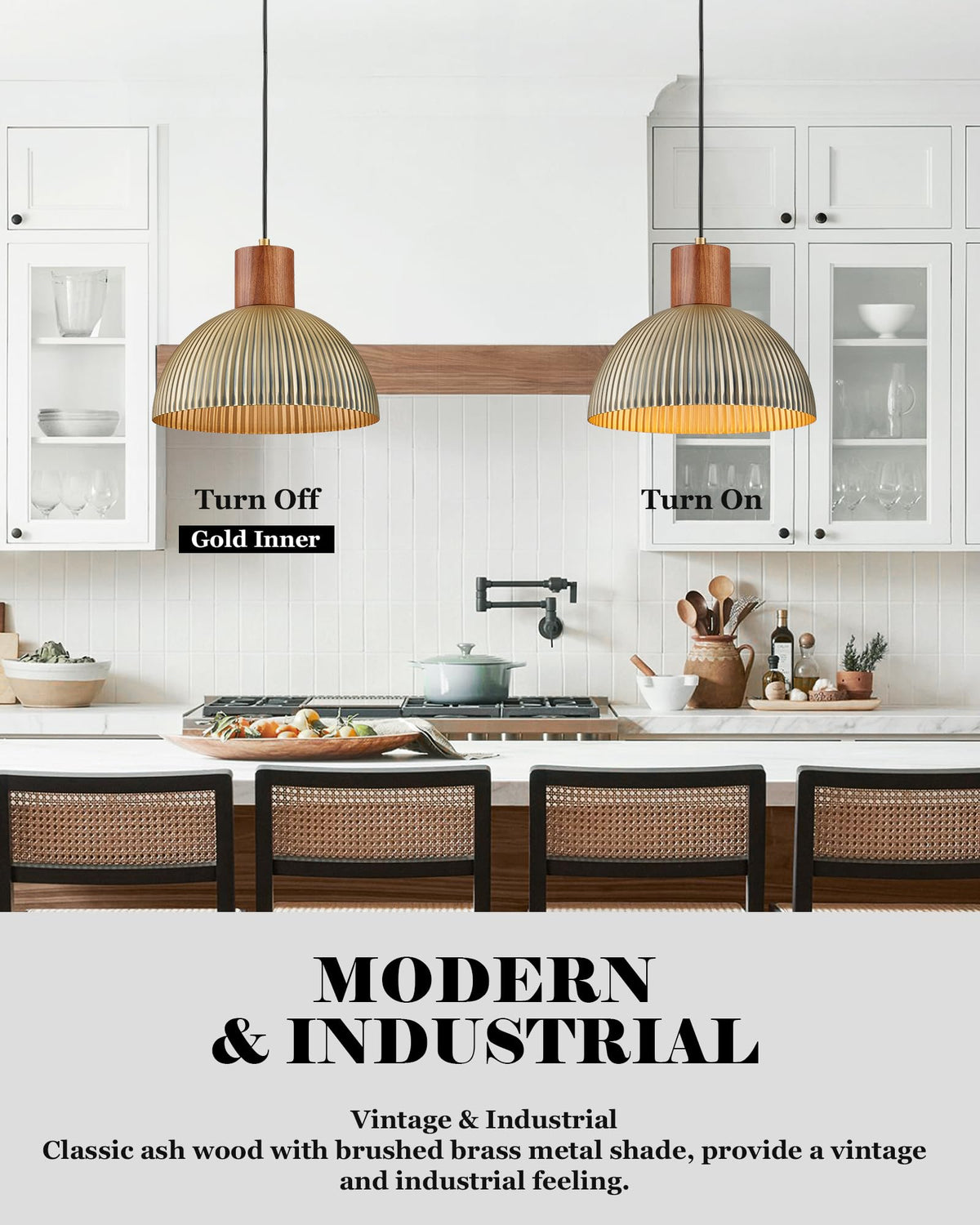 Elyona Vintage Ash Wood Dome Pendant Light 12'' Hanging Lamp With Brushed Brass Metal Shade & Gold Inner Finish, Modern Pendant