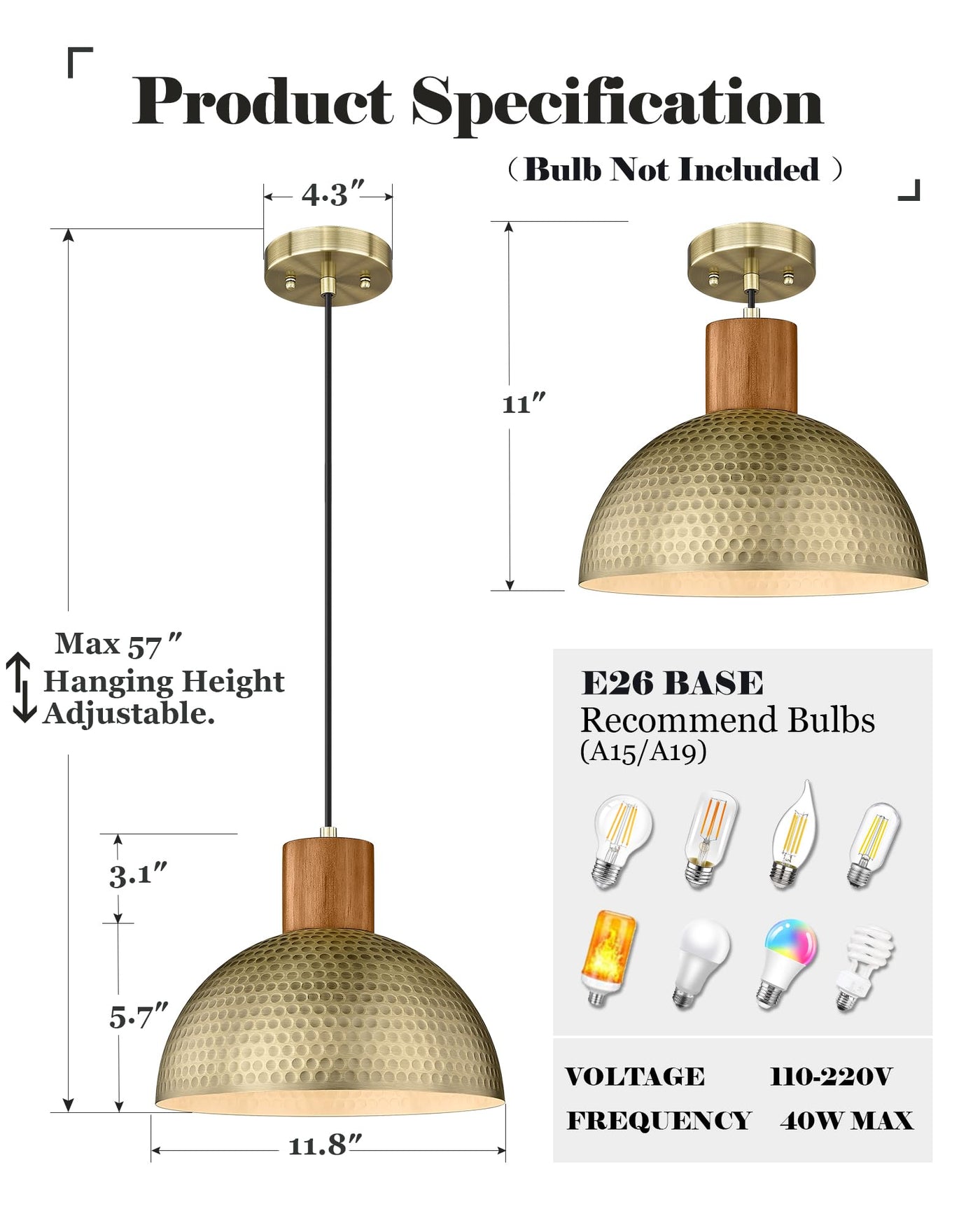 Q: What type of bulbs can I use with the ELYONA Vintage Pendant Light?A: The ELYONA Vintage Pendant Light is compatible with LED, CFL, and Edison bulbs with an E26 base, supporting bulbs that are less than 40W. For a dimmable effect, ensure you use a dimmer switch and a dimmable bulb (bulbs are not included).