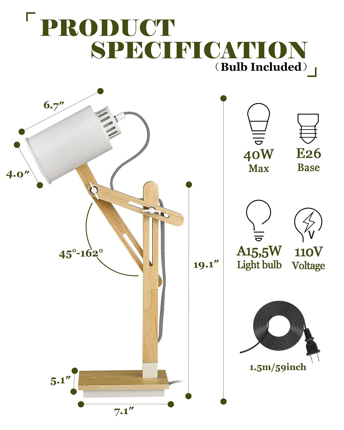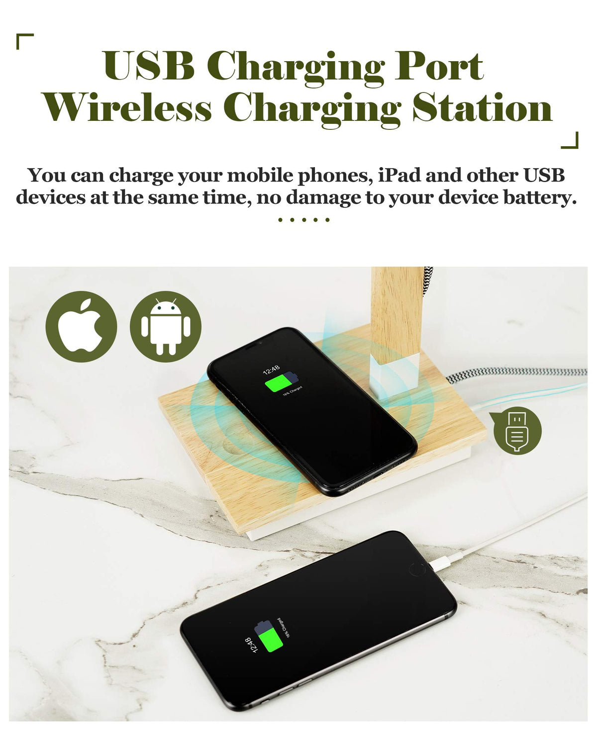 Elyona Wireless Charging White Desk Lamp, Touch Control Rubber Wood Table Lamp With Usb Charging Port, Swing Arm Reading Task Lights For Office, Dorm, Living Room Bedroom, Farmhouse, Bulb Included