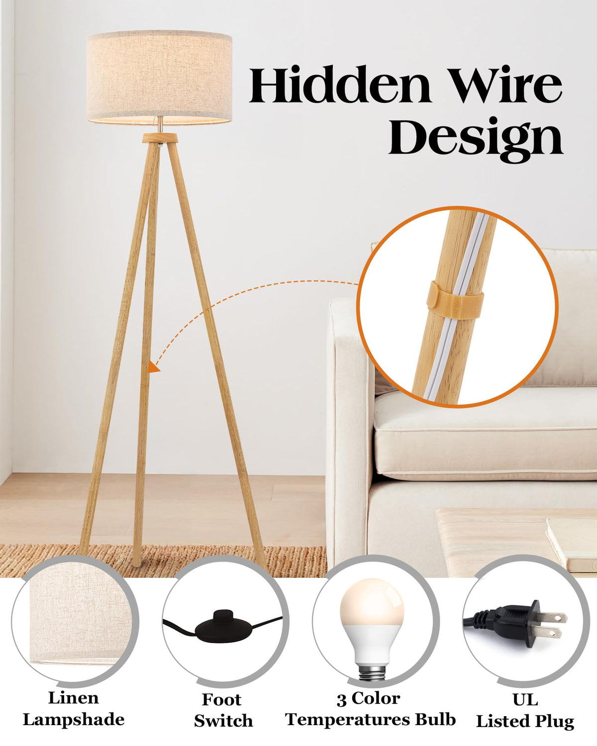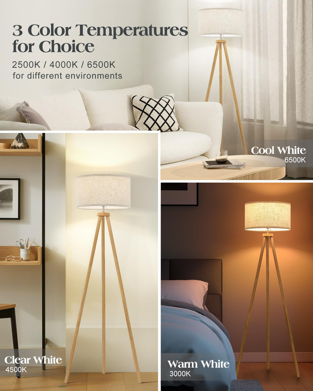 Elyona Wood Tripod Floor Lamp For Living Room, Nordic Standing Lamp With 3 Color Temperatures Led Bulb Included & Beige Linen Sh