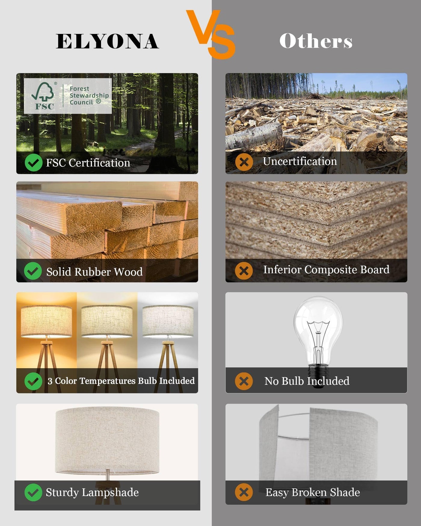 ? Hand Painted & FSC Listed Solid Wood ?Compared with other products, our wooden legs are thicker and more stable. NO MDF, NO Laminate, NO Veneer. ELYONA use high-quality FSC listed solid wood boards, Waterproof and anti-scratch,very easy to clean.Give consumers a better user experience. All our productions are designed by ourselves, we are direct manufacturers of our products. Each floor lamp is hand painted by experienced masters in our factory . Each piece is unique for you. ? Stylish Modern Solid Wood Tripod Floor Lamp? ELYONA standing lamp is combined with wood side table to put your phone, coffee cup, ornaments, magazine. It easy to match with a range of decor styles including rustic, industrial,farmhouse,boho,country, apartment or loft etc. Add a touch of modern natural feeling to your life.?The foot switch is convenient for enabling you to turn it on/off or adjust the light color with ease. ?Includes a 3-Color Temperatures LED Bulb (9W) offering 3000K warm light, 4500K natural light, and 6000K white light, providing suitable lighting for different usage scenarios, such as a night light in the bedroom, an ambient light or a reading light in the living room.?( please assure the replace bulb is less than 60 Watts) ?LED Energy-Saving Bulb Included?E26 LED bulb included (3000k / 9w). Long lifespan 25, 000 hours lifetime of the bulb can save your money greatly, and you won't need to replace them frequently. linen lamp shade, provide a gentle ambient brightness to create a comfortable environment and cozy for your eyes. perfect for reading, work, or rest. ( pls assure the replace bulb is less than 60 Watts)