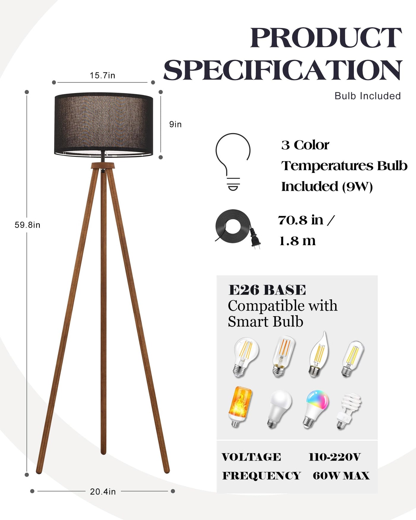 ? Hand Painted &Amp; Fsc Listed Solid Wood ?Compared With Other Products, Our Wooden Legs Are Thicker And More Stable. No Mdf, No Laminate, No Veneer. Elyona Use High-Quality Fsc Listed Solid Wood Boards, Waterproof And Anti-Scratch,Very Easy To Clean.Give Consumers A Better User Experience. All Our Productions Are Designed By Ourselves, We Are Direct Manufacturers Of Our Products. Each Floor Lamp Is Hand Painted By Experienced Masters In Our Factory . Each Piece Is Unique For You. ? Stylish Modern Solid Wood Tripod Floor Lamp? Elyona Standing Lamp Is Combined With Wood Side Table To Put Your Phone, Coffee Cup, Ornaments, Magazine. It Easy To Match With A Range Of Decor Styles Including Rustic, Industrial,Farmhouse,Boho,Country, Apartment Or Loft Etc. Add A Touch Of Modern Natural Feeling To Your Life.?The Foot Switch Is Convenient For Enabling You To Turn It On/Off Or Adjust The Light Color With Ease. ?Includes A 3-Color Temperatures Led Bulb (9W) Offering 3000K Warm Light, 4500K Natural Light, And 6000K White Light, Providing Suitable Lighting For Different Usage Scenarios, Such As A Night Light In The Bedroom, An Ambient Light Or A Reading Light In The Living Room.?( Please Assure The Replace Bulb Is Less Than 60 Watts)&Nbsp;?Led Energy-Saving Bulb Included?E26 3&Nbsp;3 Color Temperatures Led Bulb Included (9W). Long Lifespan 25, 000 Hours Lifetime Of The Bulb Can Save Your Money Greatly, And You Won'T Need To Replace Them Frequently. Linen Lamp Shade,&Nbsp; Provide A Gentle Ambient Brightness To Create A Comfortable Environment And Cozy For Your Eyes. Perfect For Reading, Work, Or Rest. ( Pls Assure The Replace Bulb Is Less Than 60 Watts)