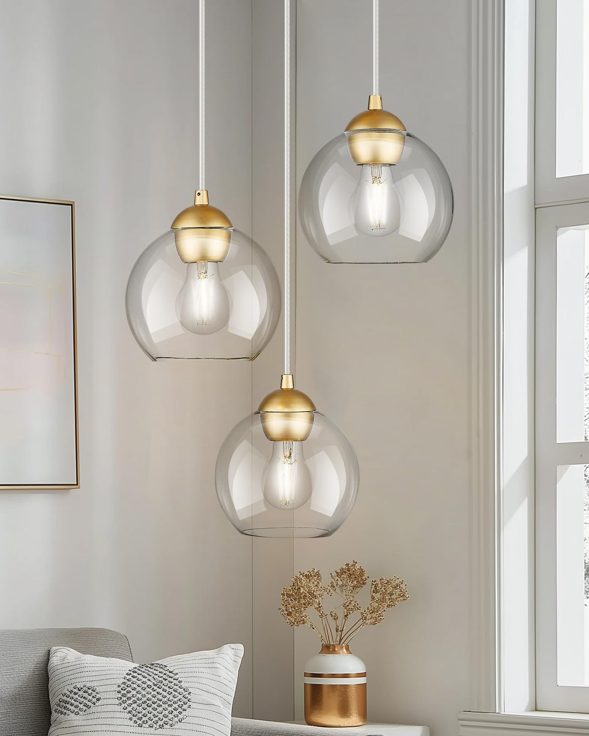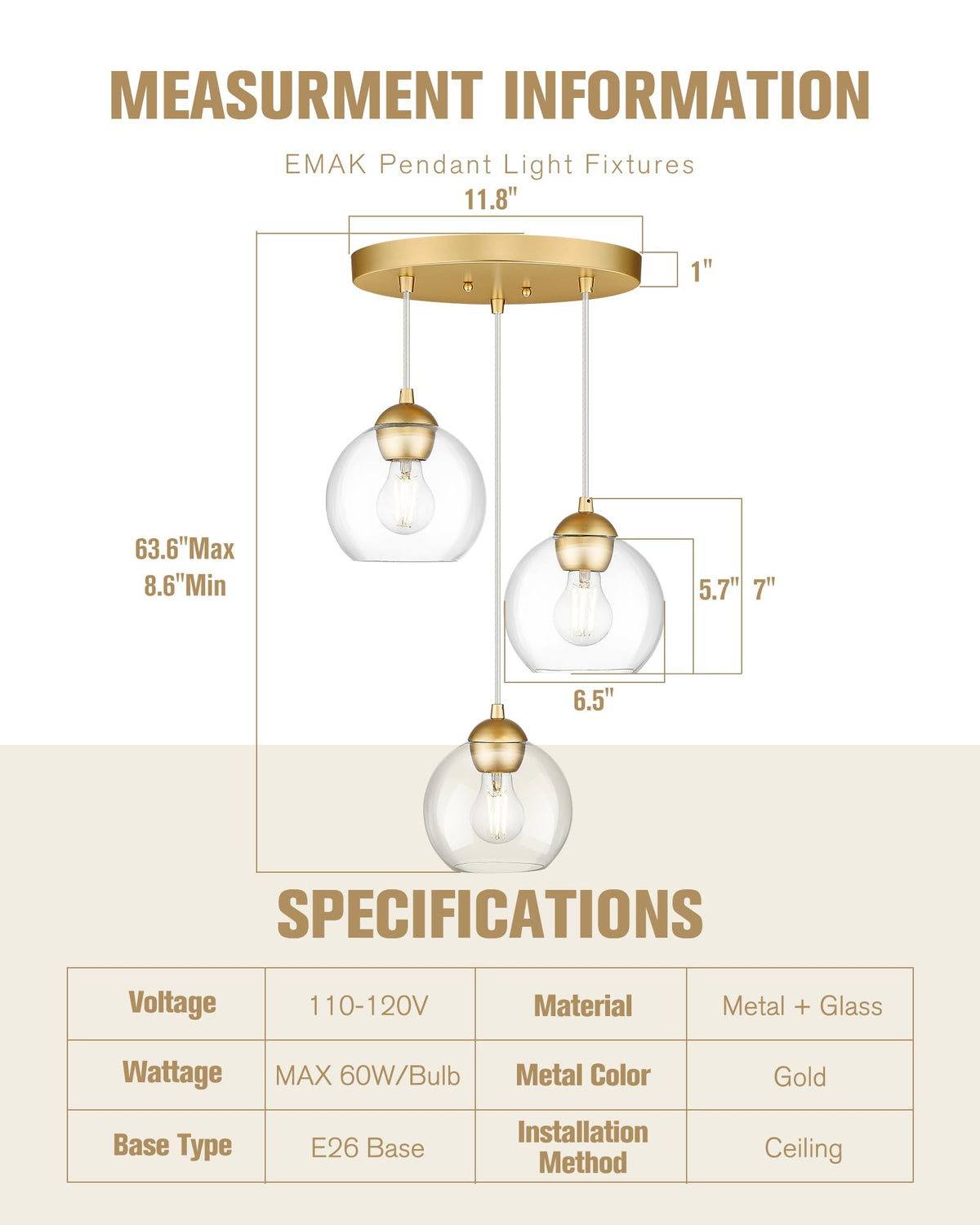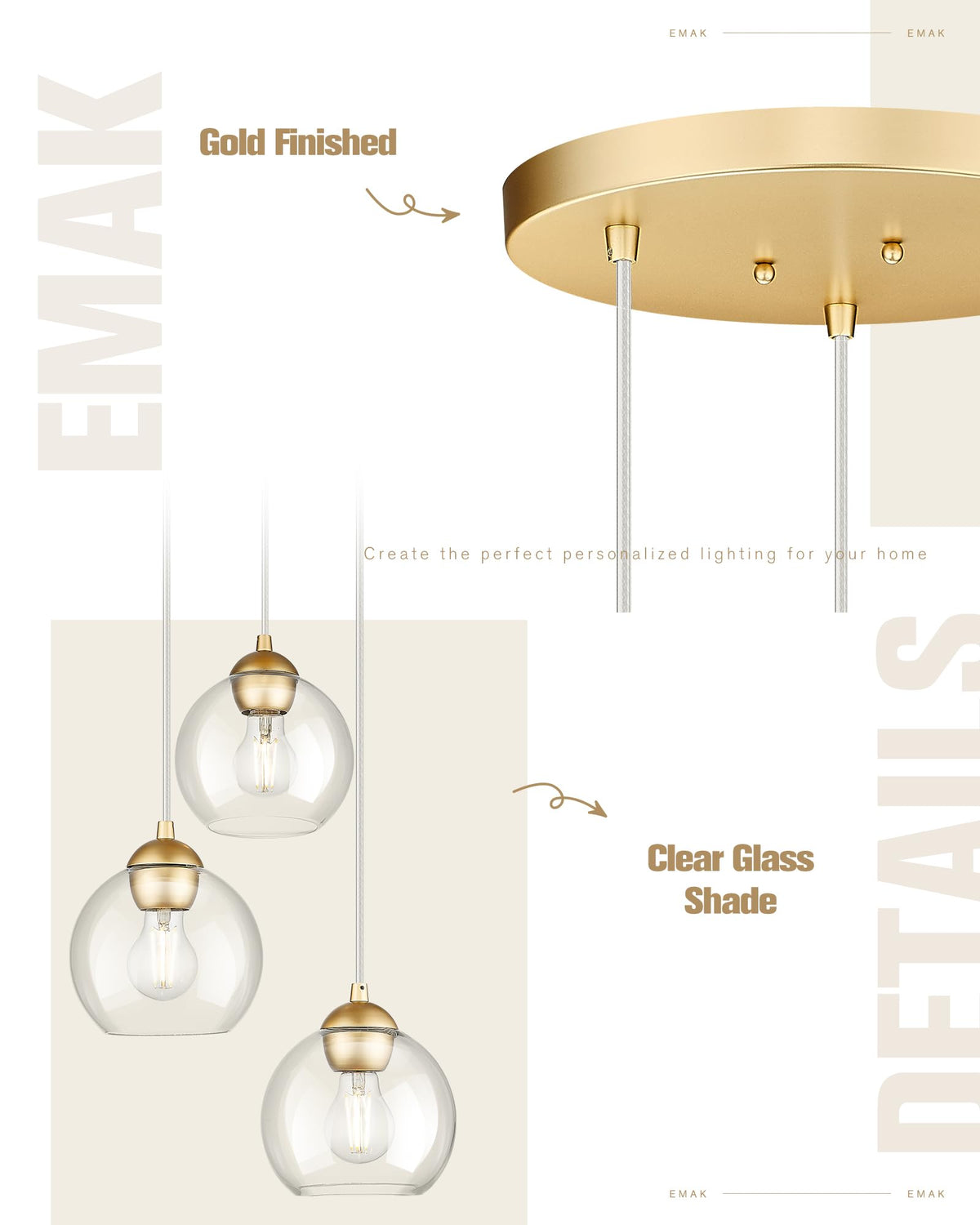 Emak 3-Light Cluster Pendant Lights Kitchen Island, Modern Gold Pendant Light Fixtures With Clear Glass Shade, 7 Inch Globe Hang