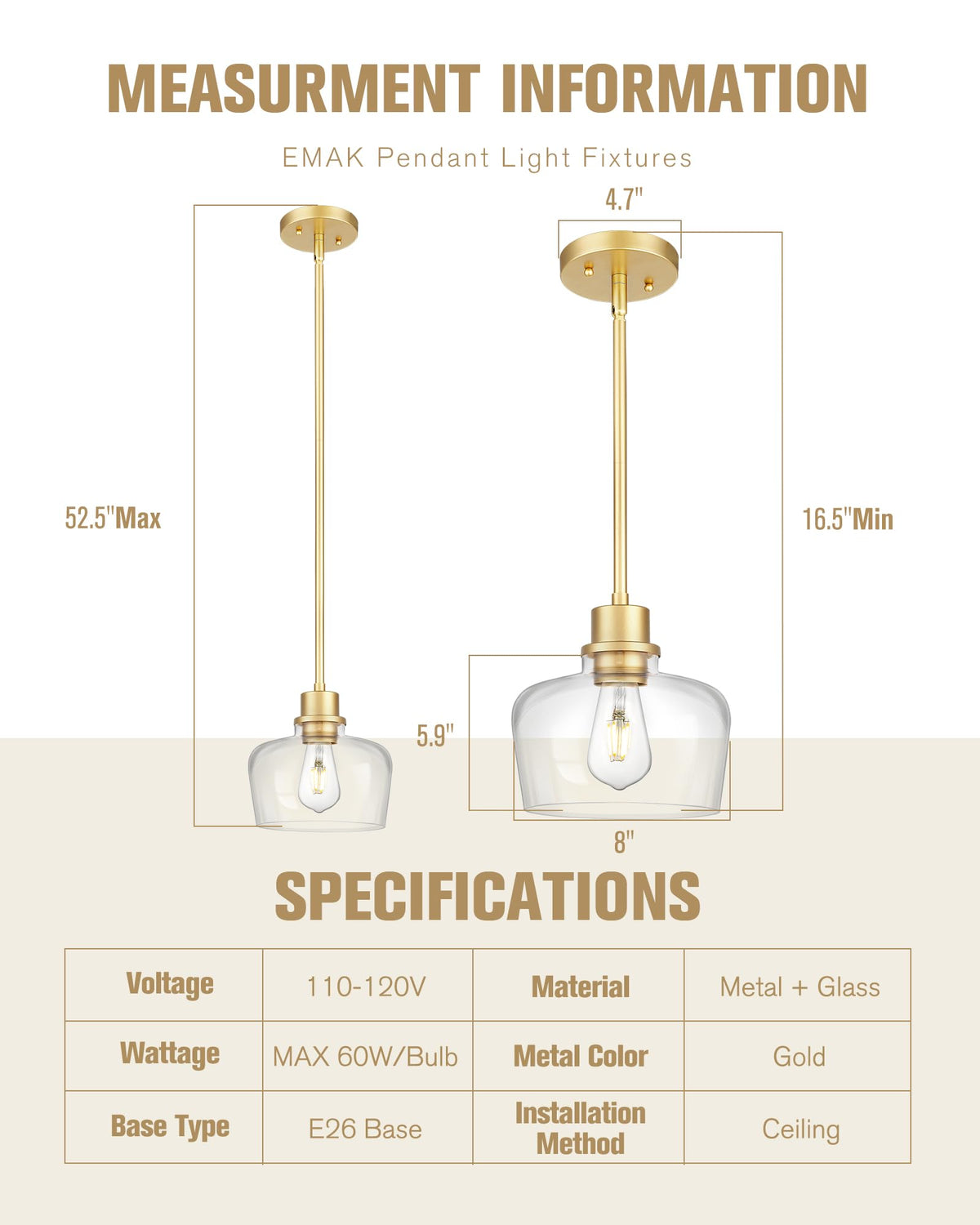 Q: What are the dimensions of the Emak pendant light?A: The glass shade of the Emak pendant light measures 8 inches in diameter and 5.9 inches in height. The round ceiling canopy has a diameter of 4.72 inches and a height of 0.8 inches. The fixture comes with removable rods of 6 inches (1 rod) and 12 inches (3 rods), allowing for a maximum hanging height of 52.5 inches and a minimum of 16.5 inches.