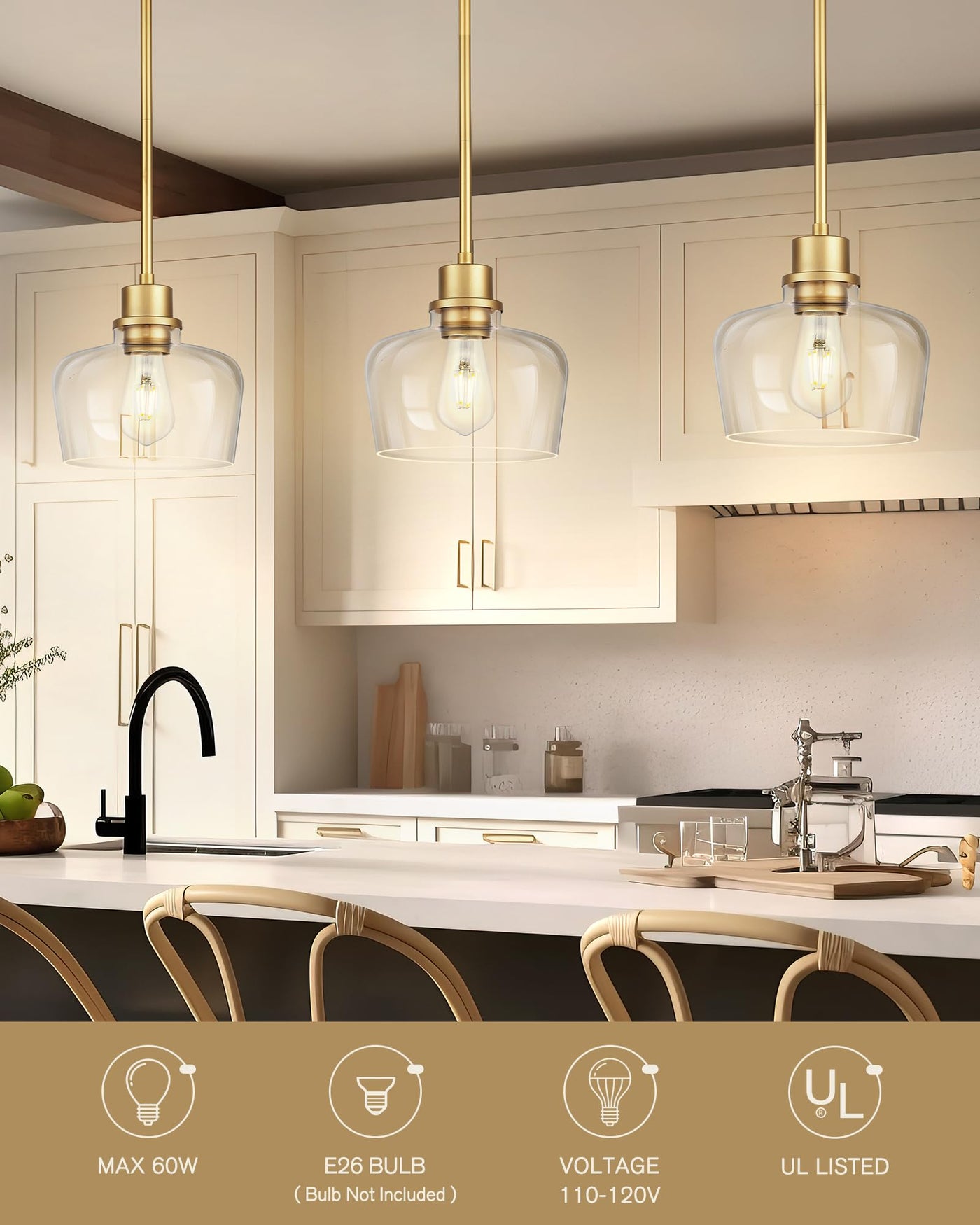 Emak 8 Inch Clear Glass Pendant Lights Kitchen Island, Modern Gold Pendant Light Fixtures For Kitchen, Bathroom, Bedroom, Dining