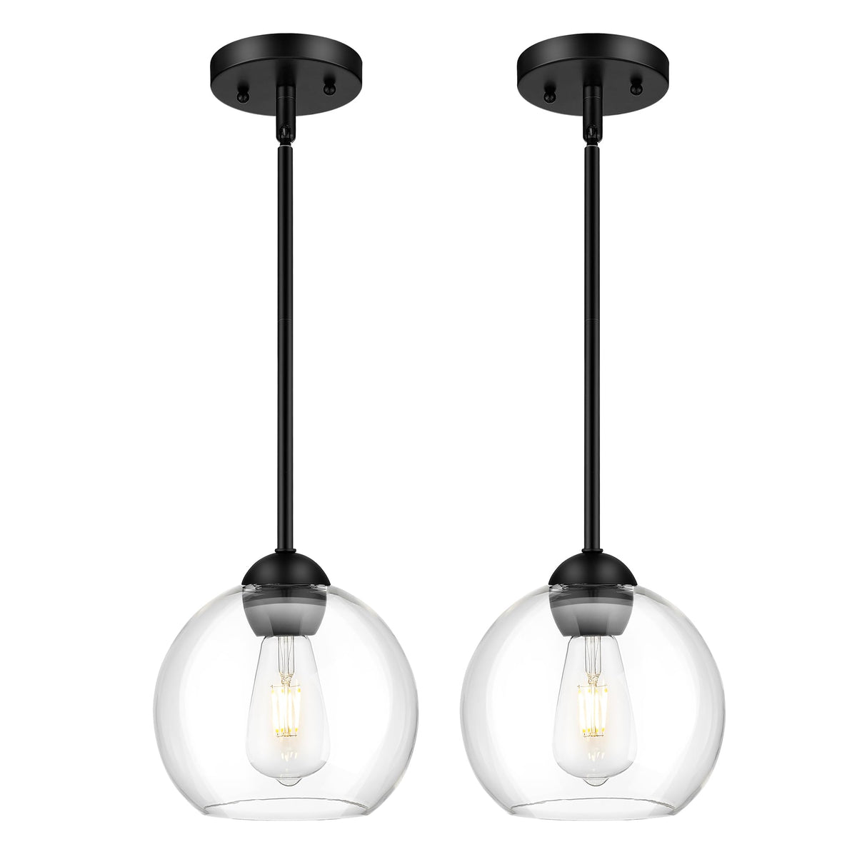 Emak 8 Inch Globe Pendant Lights Kitchen Island, Modern Black Pendant Light With Clear Glass Shade, 2 Pack Hanging Light Fixture
