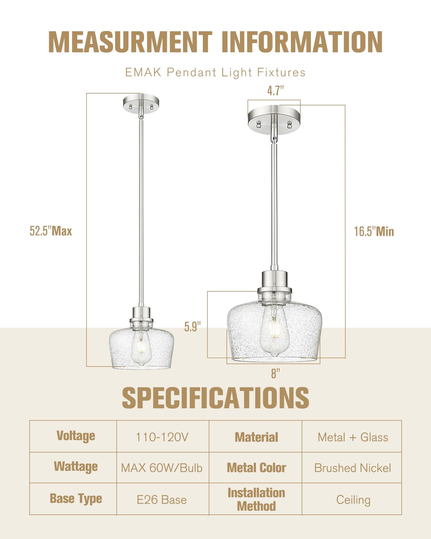 Emak 8 Inch Pendant Lights Kitchen Island, Modern Brushed Nickel Pendant Light Fixtures With Seeded Glass Shade, 1 Light Hanging