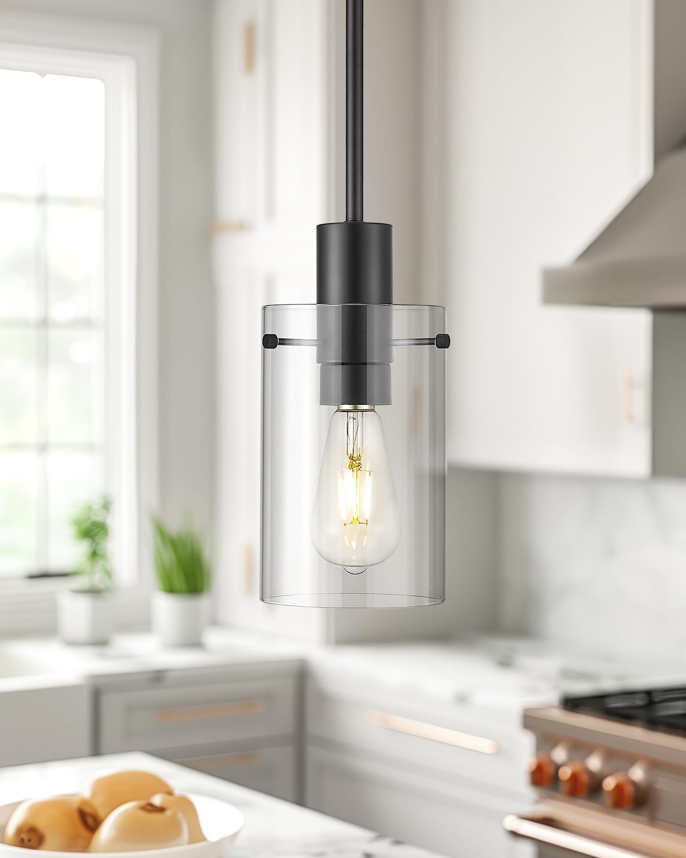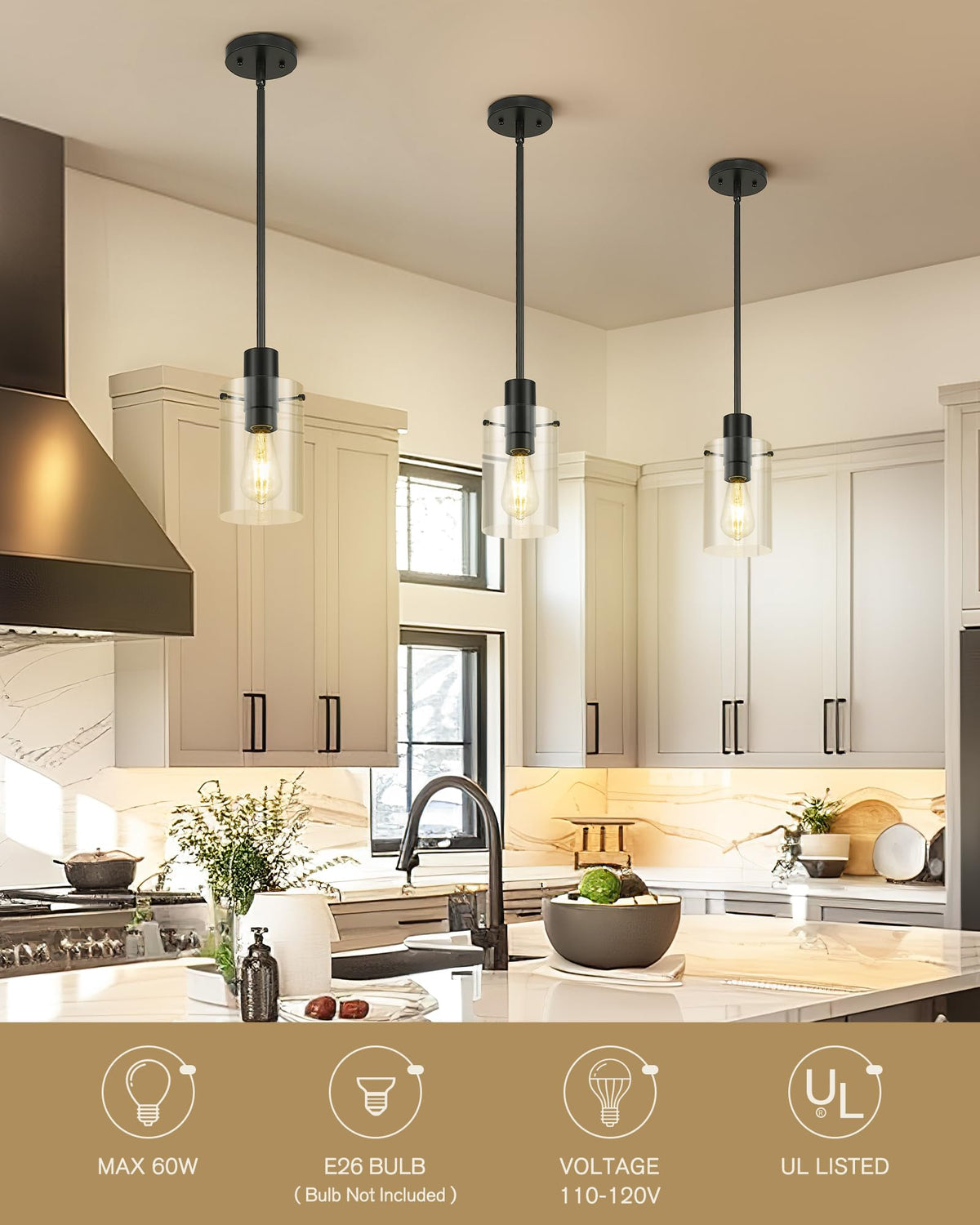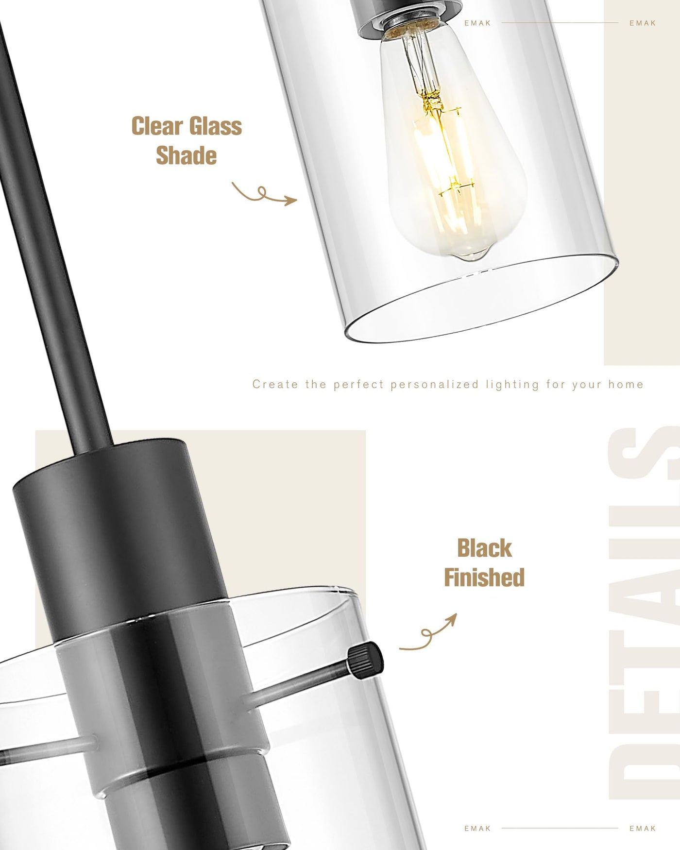 Q: What is the style of the Emak Black Pendant Lights?A: The Emak Black Pendant Lights feature a modern farmhouse design characterized by a sleek black metal finish and clear glass shade. They serve not only as lighting but also as an artistic centerpiece that enhances the decor of kitchens, dining areas, and living spaces.