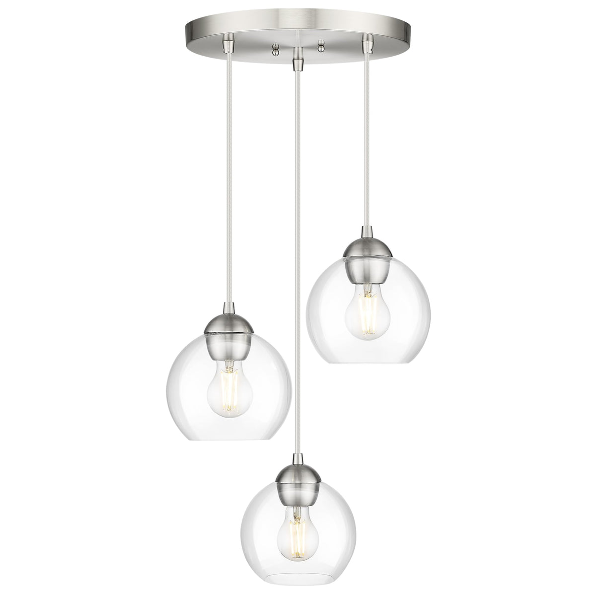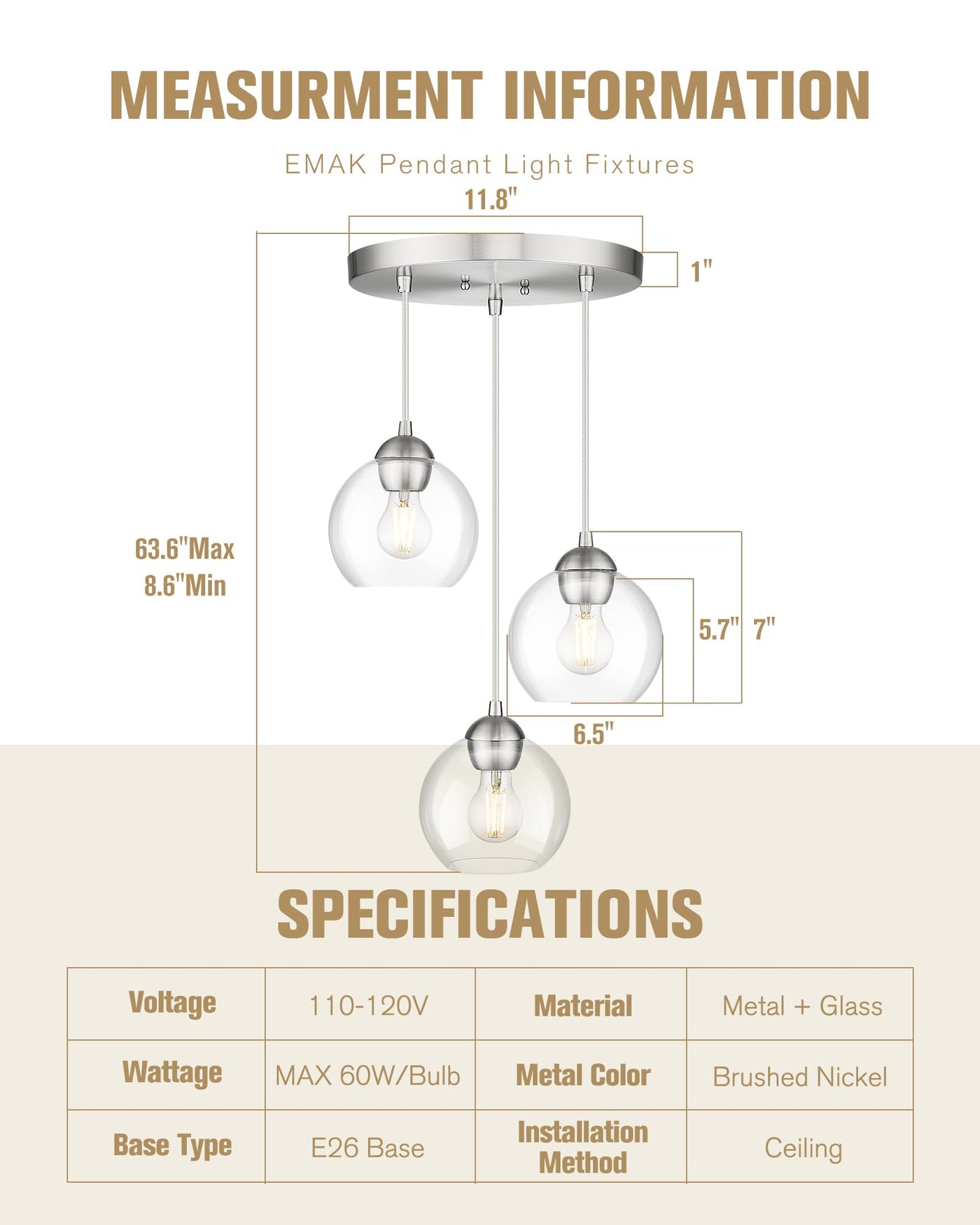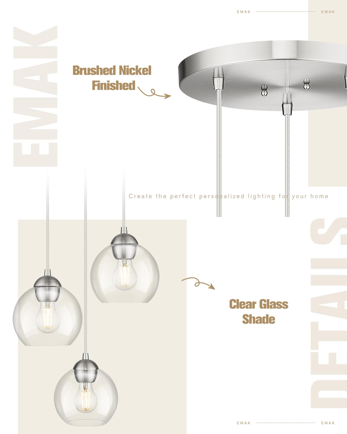 Emak Brushed Nickel Pendant Light, 3-Light Pendant Lights Kitchen Island With Clear Glass Shade, Cluster Globe Hanging Light Fix