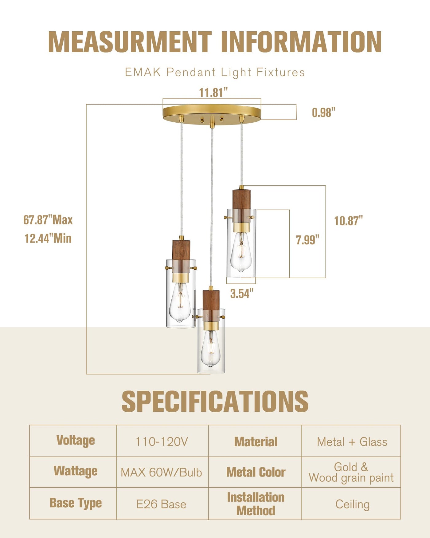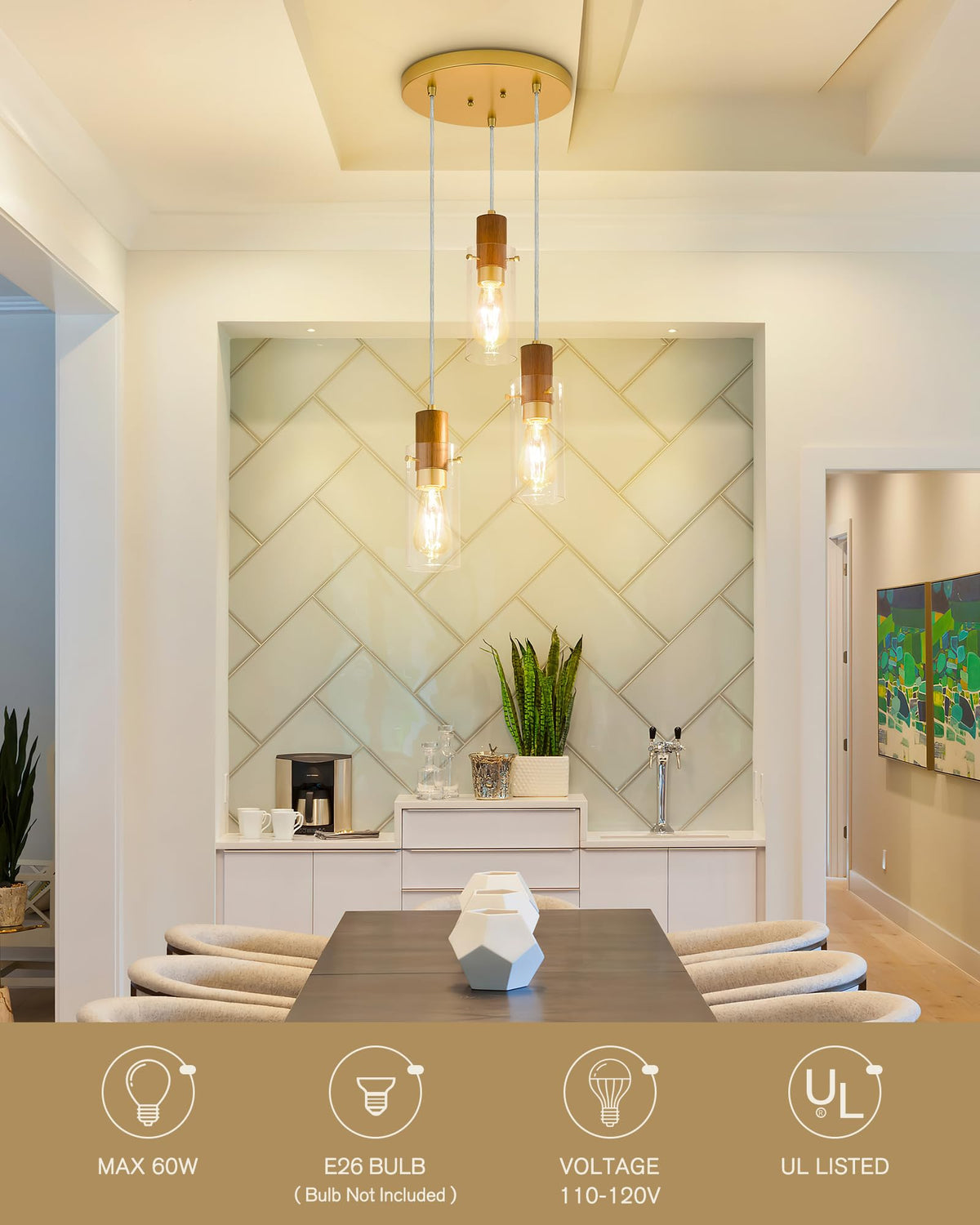 Emak Gold Pendant Light Fixtures, 3-Light Pendant Lights With Clear Glass Shade, Modern Farmhouse Hanging Lights For Kitchen Island, Dining Room, Bathroom, Bedroom, Pl120-Gd-Cl