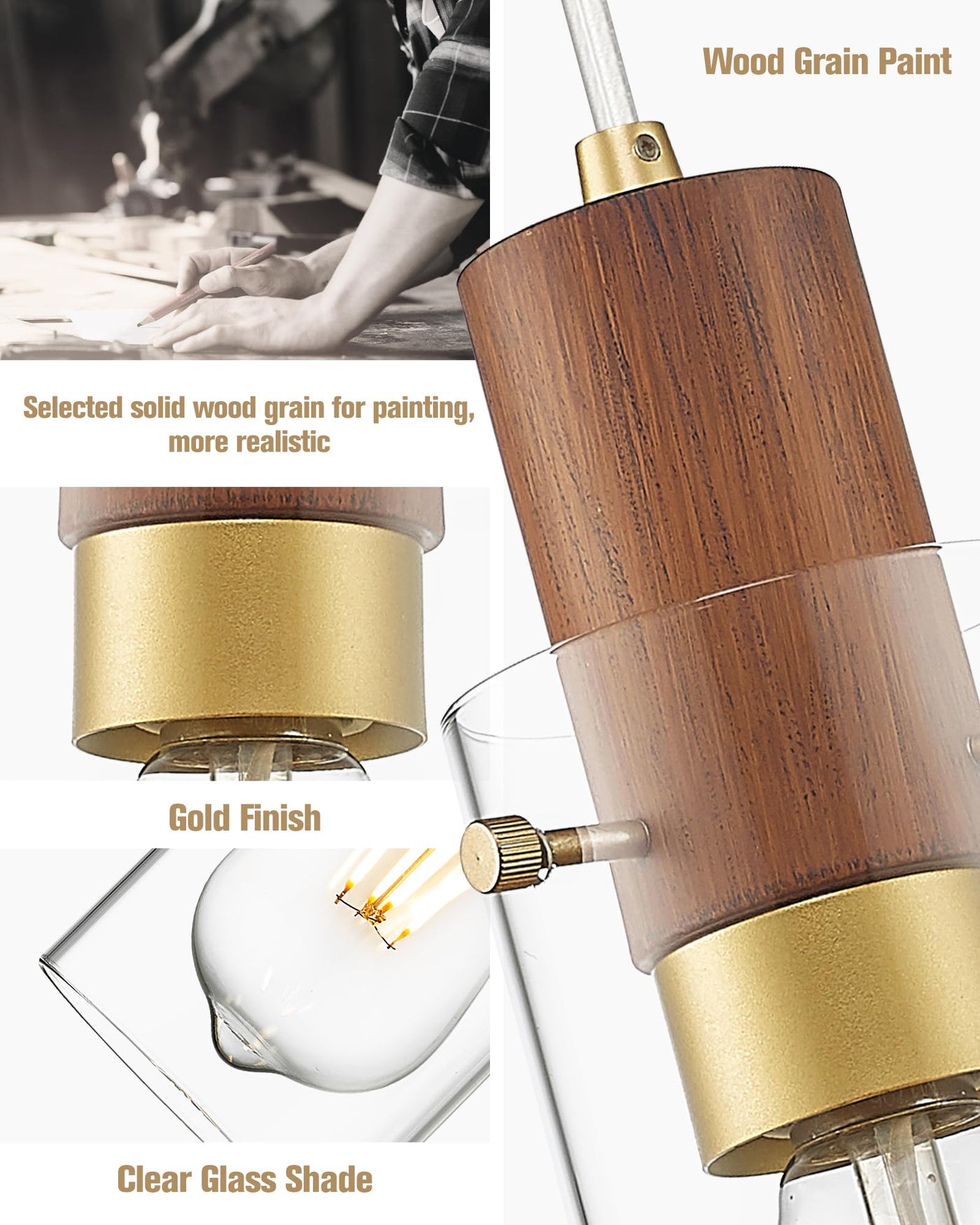 Q: What materials are used in the Emak Gold Pendant Light?A: The Emak Gold Pendant Light features a matte brushed champagne brass finish along with a clear glass shade. It also includes wood grain elements, but please note that these are not made from solid wood.