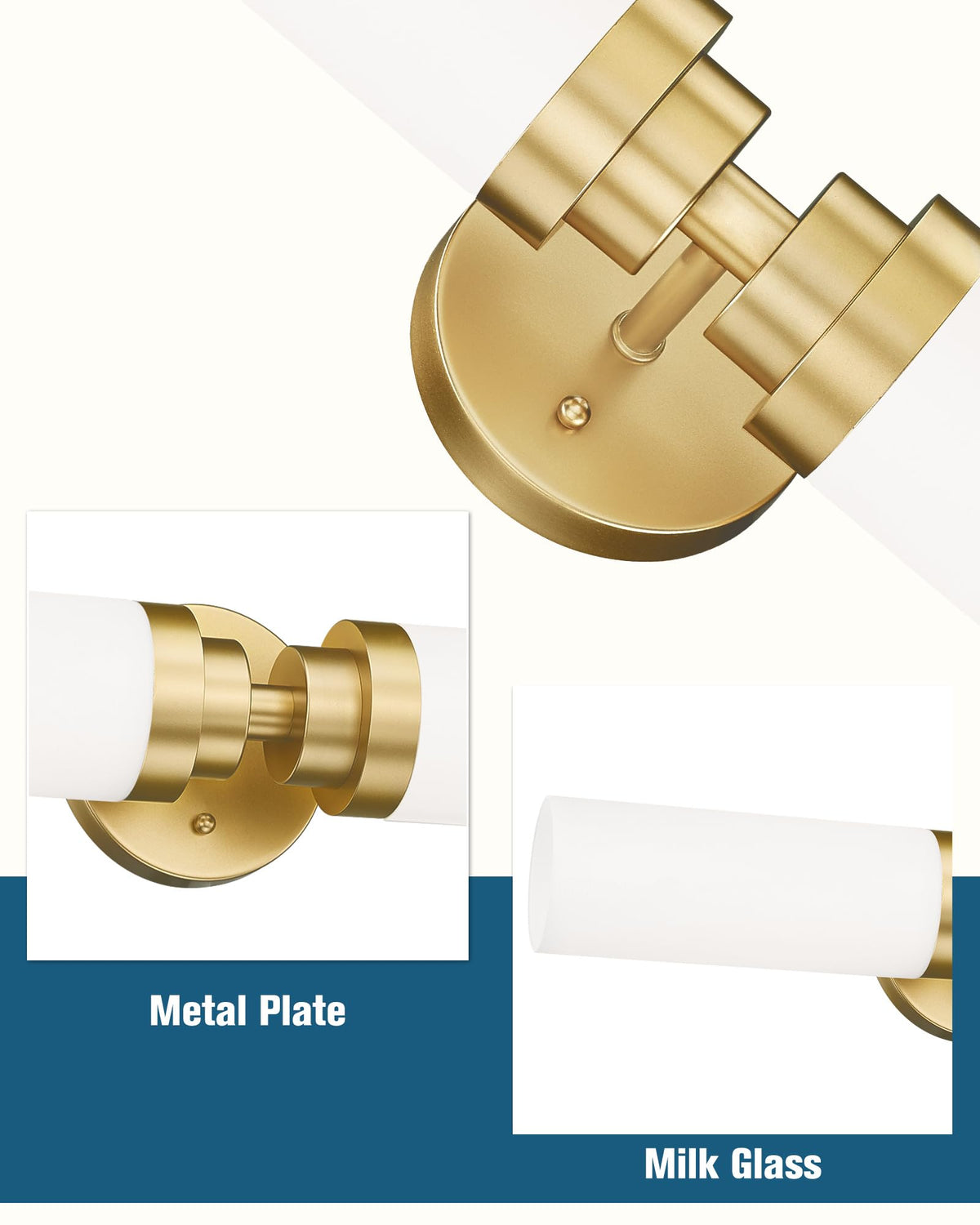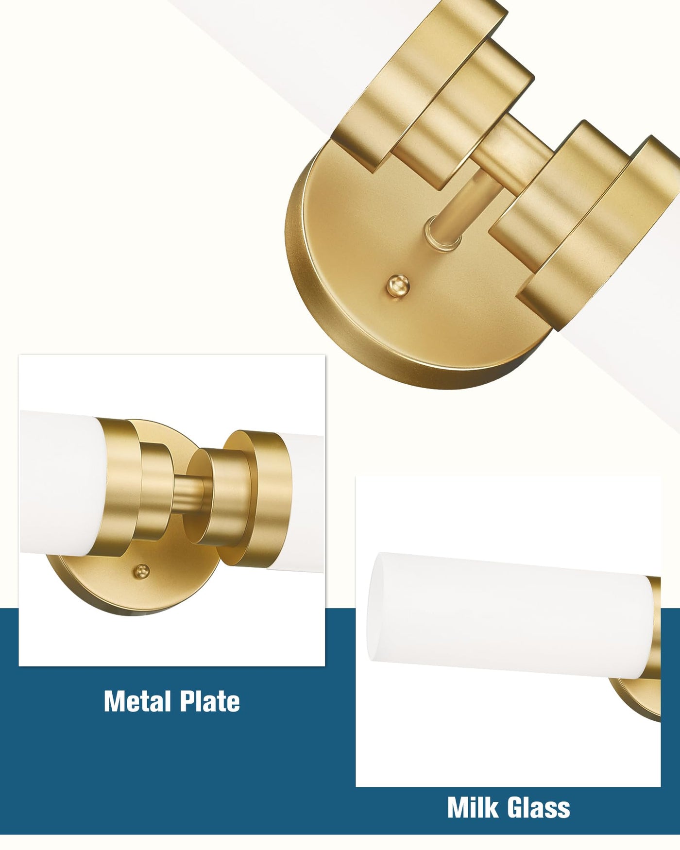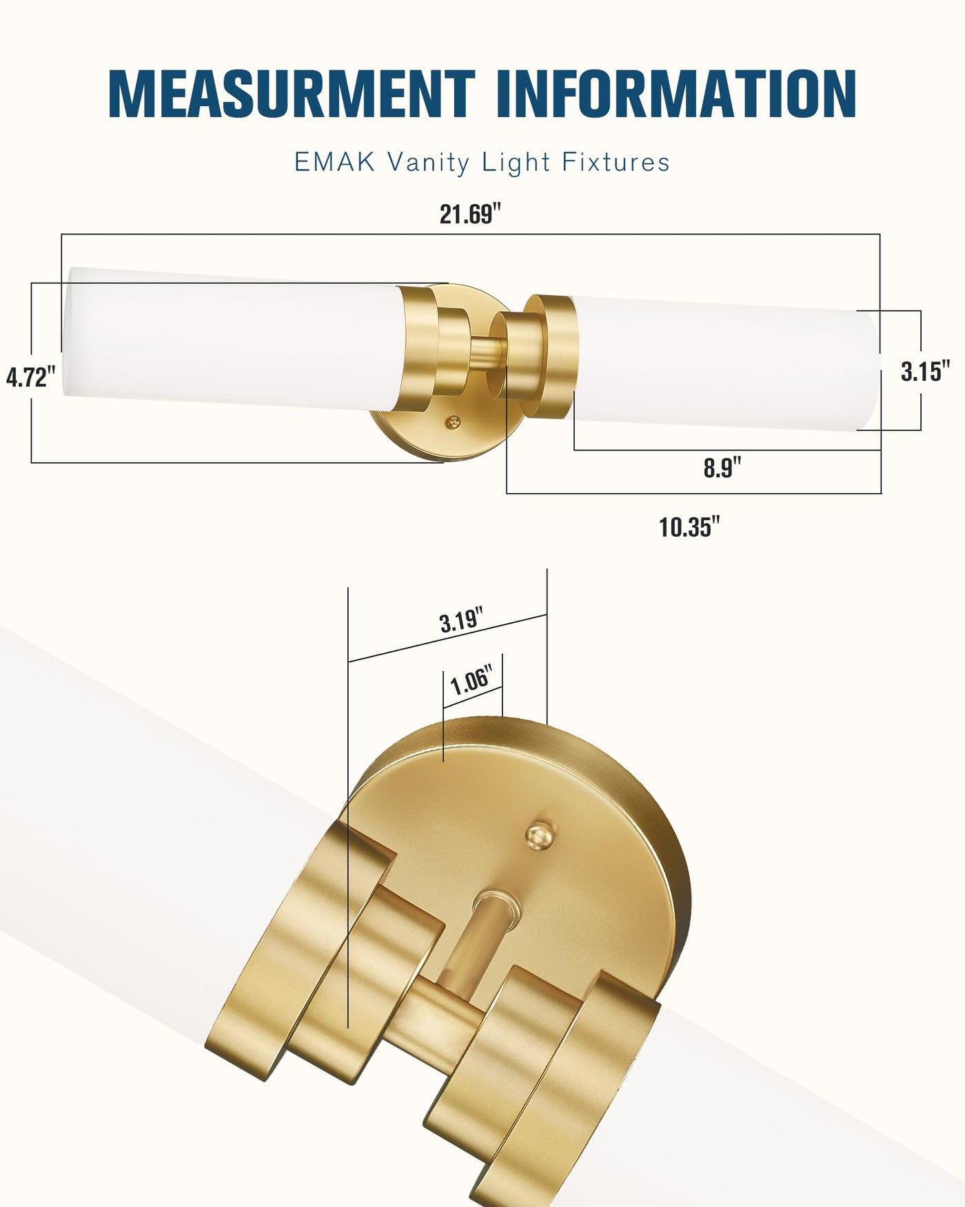 EMAK modern vanity lights for bathroom, brass champagne gold bathroom light, 21 inch 22 inch bathroom vanity light fixtures with white milk glass shade, 2 light gold indoor wall sconce light, Cylinder sconces wall lighting gold light fixture bathroom