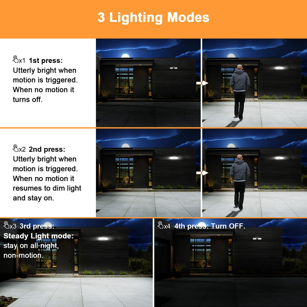 Q: What are the different lighting modes of the EMANER Outdoor Motion Lights?A: The EMANER Outdoor Motion Lights feature three lighting modes: Mode 1 activates full brightness when motion is detected and turns off after a 60-second delay without motion. Mode 2 keeps the light on at a dim level and switches to 100% brightness upon detecting motion. Mode 3 allows the light to remain on all night at 50% brightness.