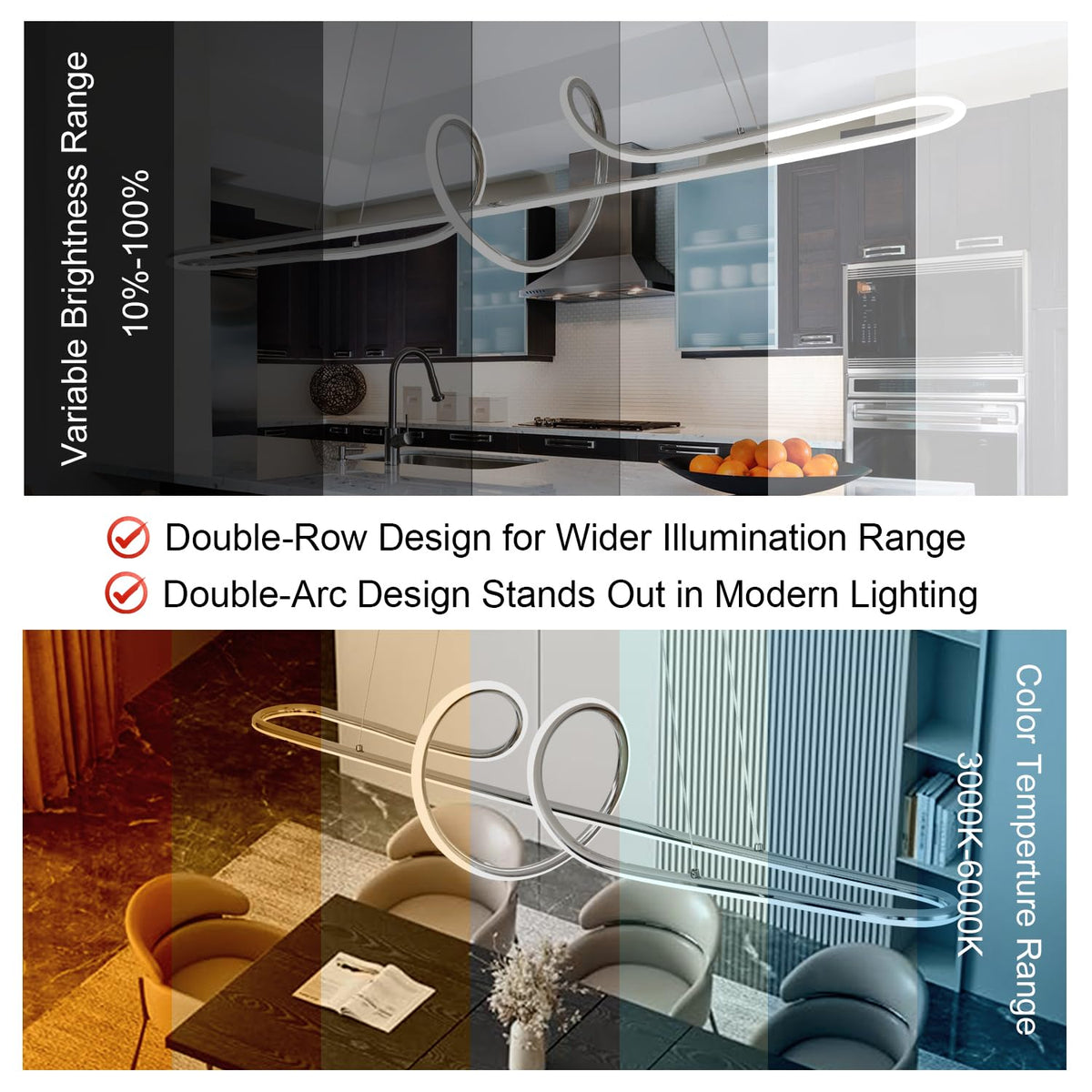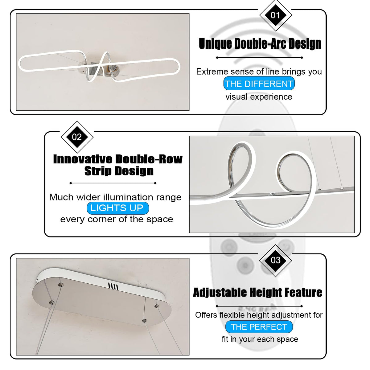 Crafted from well-made aluminum, this chandelier features an electroplated chrome finish that adds a touch of luxury and style. The modern double-arc design draws inspiration from natural curves, creating a captivating silhouette that serves as a statement piece in any space. The adjustable hanging wire lengths allow for personalized installation, accommodating various ceiling heights seamlessly. With the ability to control brightness and color temperature via remote, this chandelier offers versatility and convenience for any occasion.