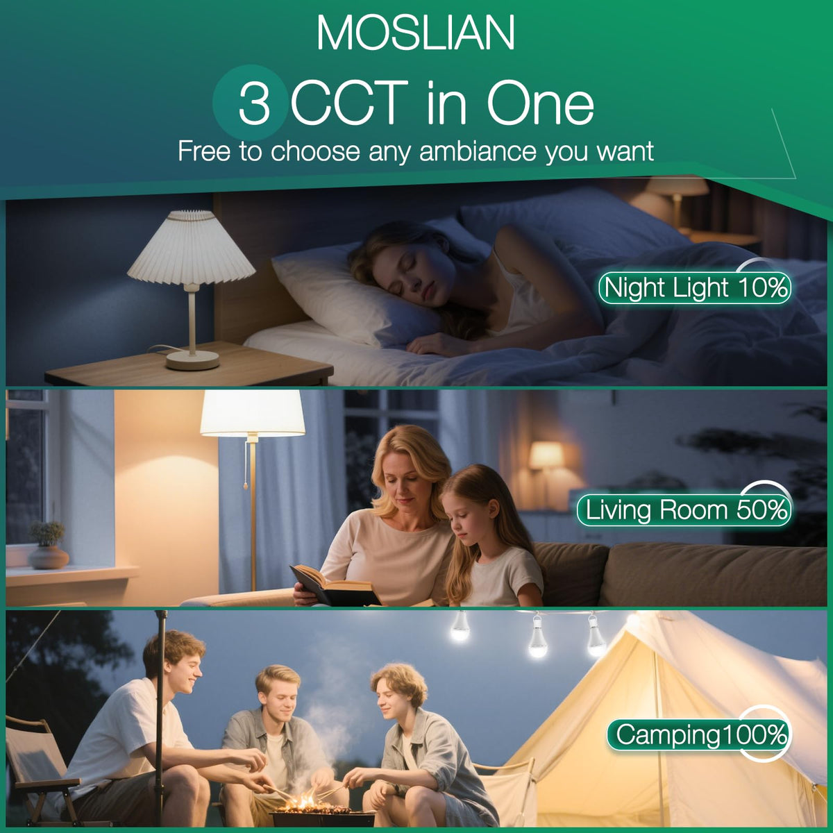Moslian rechargeable light bulbs will keep your home lit for 14 hours in the event of a power outage. Simply screw our emergency bulb into the socket and use it like a regular bulb, it will automatically recharge in preparation for a power outage and when the power is out, the power switch is on and our bulb is still on. Specification Power: 12W Voltage: 85-120 Volt Lumens: 850 lumens (60W Equivalent) Light Color: Daylight:6000K Emergency Time:14 hours Base: E26/E27 Frequently Asked Questions Q:Can this rechargeable light bulb be used as a normal electric light bulb? A:The light bulbs that stay on during power outage are great. It works as a standard light bulb without power failure, turning it on and off with a switch. Q: How do I use these LED Battery Light Bulb? A: It's the same as a regular bulb, screwed in anywhere you want to use it, like a ceiling fixture, a desk lamp in a room, a floor lamp in a living room, etc