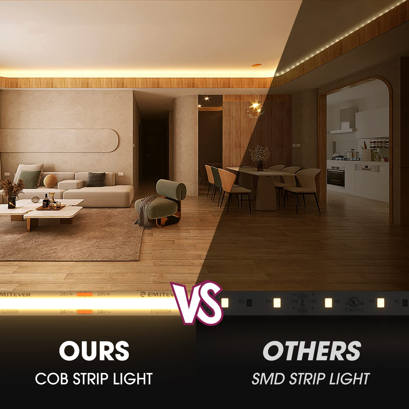 EMITEVER COB LED Strip Specifications ·Color:3000K Warm White ·The higher the display index, Ra>90+ ·LEDs Quantity:1600LEDs ·Strip Light Length:5M/16.4FT ·Input Voltage: 100-240V AC ·Waterproof: IP30 ·Lifespan: 50,000 hrs Easy to use: COB Strip Kit includes 16.4ft light strip, controller, RF remote control and power adapter. Professional product matching makes your use faster and more convenient. Cuttable and Linkable The strip light is cuttable and linkable, design a fit length of strip light according your need. (connector included) Flexible Operations Slim, compact and flexible PCB strip. Mount end-to-end for bendable or angled patterns, or in continuous rows. Durable By adopting qualified FPC circuit board and LEDs, the strip has excellent heat dissipation, making it much more durable. Widely Use It very suitable for living room, kitchen, under cabinet, counters, cupboard, shelf, TV backlighting, dining room, bedroom, party, stair, wedding, hutches, bar, car, workbench, bookcase, jewelry case, showcase, wine cellar and more.