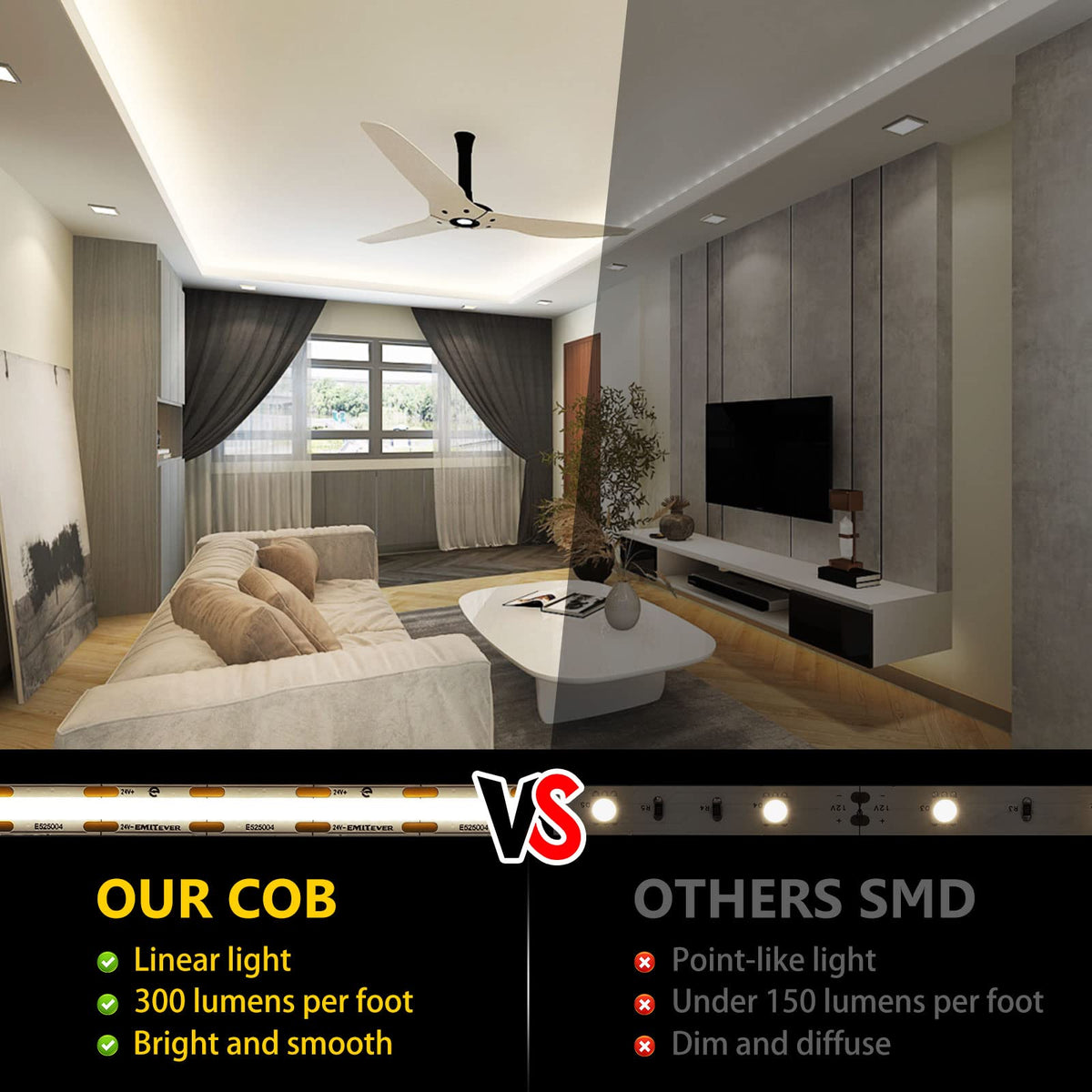 Q: What applications are suitable for the EMITEVER COB LED Strip Lights?A: The EMITEVER COB LED Strip Lights are ideal for various applications including general accent lighting, under-cabinet lighting, ambient lighting, and more.