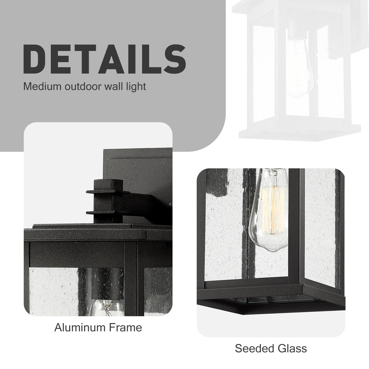 Q: What is the size of the Emliviar outdoor wall mount lights?A: The Emliviar outdoor wall mount lights measure 6 inches in length, 7 inches in width, and 12.25 inches in height. The back plate dimensions are 4.5 inches by 7.83 inches.