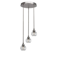(2143-BN-5110) Empire 3 Light Cluster Pendalier In Brushed Nickel Finish With 6" Clear Ribbed Glass. Rated for: Dry location. Light Bulb Data: 3 Medium 100 Watt. Bulb Included: No.