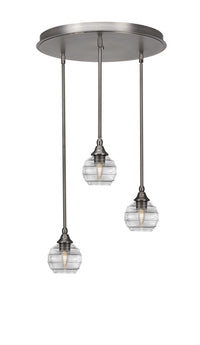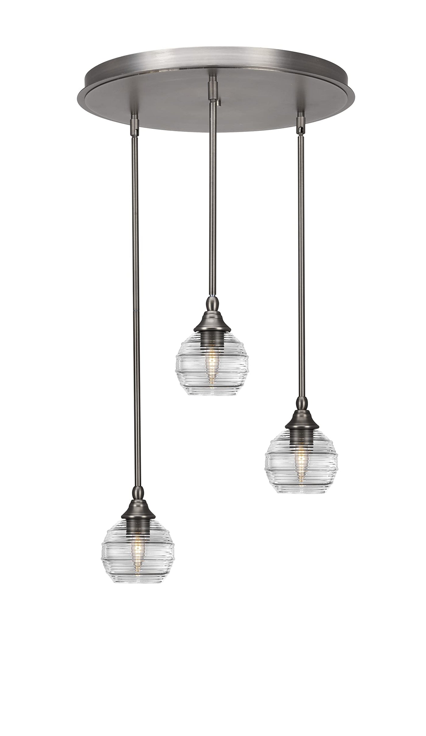 (2183-BN-5110) Empire Empire 3 Light Cluster Pendalier In Brushed Nickel Finish With 6" Clear Ribbed Glass. Rated for: Dry Location. Light Bulb Data: 3 Medium 100 watt. Bulb Included: No.